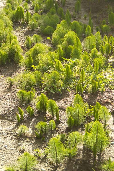 This is not an aerial photo of a pine forest, it is actually a remnant from the dinosaur age making its presence known in my yard. As much as I love springtime, with its profusion of colorful blooms, there is one part that I dread. It also signals the return of the horsetails. Although they can be found in our yard year-round, it seems like every spring they really get out of control. Nothing kills them and they will even grow through asphalt. So the best you can do is pull or whack the tops off, and then do it again a few days later when they grow right back. They developed this habit because dinosaurs were voracious eaters and it guaranteed their survival, right into the 21st century.