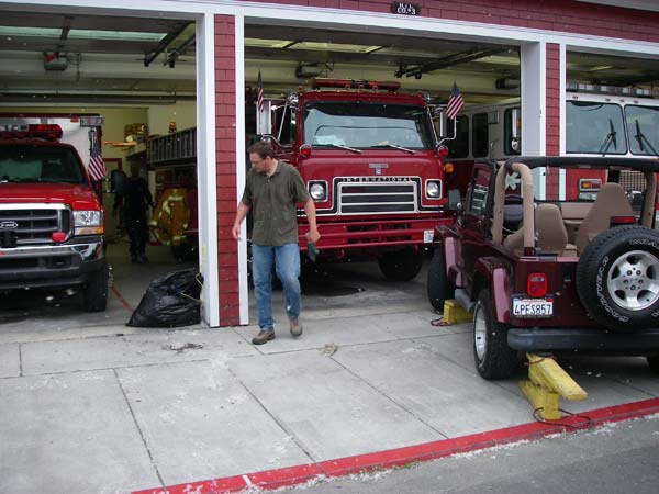 We had a simulated car into tree crash, with Tom Ford, our resident paramedic playing the part of the drunk driver. He purposely wore old clothes so that we could get experience cutting off clothes. His big mistake though was wearing an old down jacket, and when they cut into it, down feathers went everywhere. Tom was pretending to be unconcious but he was having a hard time maintaining the acting once feathers started going up his nose and in his mouth. After a while there were feathers everywhere and it looked like the jeep hit a truck full of chickens, rather than a pretend tree. Some bright individual decided to use a ventilation fan to disperse the feathers, and for a while it looked like it was snowing on Brown St.