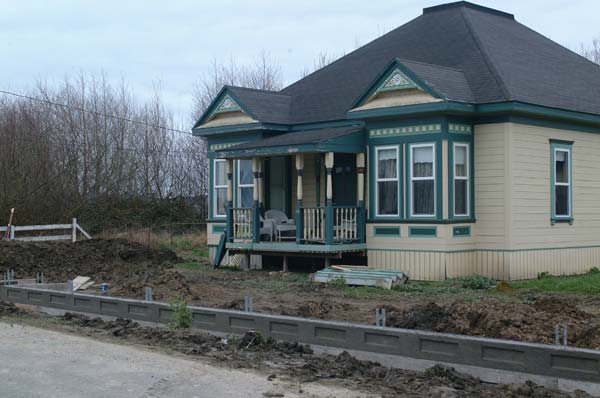 Yesterday they poured the cement for the base, and this morning they took the forms off. The recessed panels in the concrete echo the panels on the bay windows rather nicely. They were going to work on the front path and the driveway today, but it started pouring rain again, so I’m not sure how much they will have accomplished.