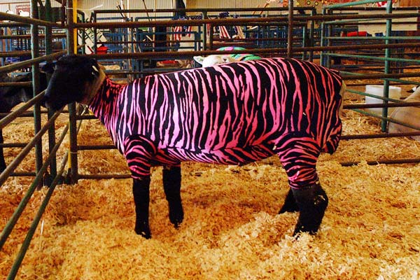 The Latest Barnyard Fashion Knowlesville Posted on August 12, 2003 by MattApril 26, 2019 This is an example of what can go wrong with genetically engineered animals. In a failed attempt to create a smaller, fuzzier zebra that would be ideal as a domestic pet, these scientists accidently created the worlds only pink sheebra.