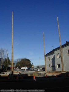 The construction crews for The Majestic started working on the sets. The city parking lot is going to be used to build the theater that plays a pivotal role in the movie. Telephone poles were driven into the ground, and then the shell of the building will be attached to those.