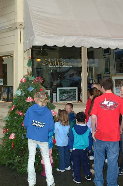 Today the kids came by and decorated our Christmas tree on Main Street. They were already in progress when we got to work, so I quickly ran in and grabbed the camera. This year I got smart and wired the top of the tree to the awning. Our windiest parts of the year is the stretch between when the trees are put up and when they come down.