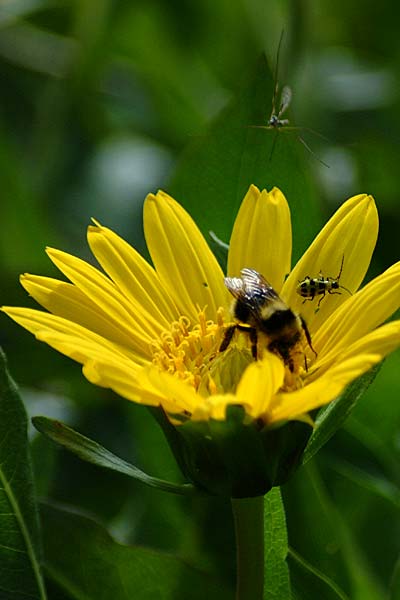 I tried looking up what type of flower this is, but my wildflower book has pages of yellow daisy looking flowers to choose from. So for now it will be known as the South Fork Yellow Daisy Looking Flower. Whatever it is, it must smell nice to bugs, because if you look closely, you’ll find three bugs all vying for it.