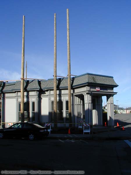 Town Hall – phase 1 Knowlesville Posted on February 9, 2001 by MattFebruary 26, 2019 They started working on the Town Hall building, which is being built on top of the U.S. Bank. Similar to what they’re doing for the Majestic, telephone poles were driven into the ground and then the rest of the building will be attached to those.