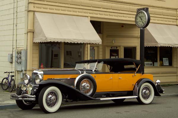 Each day before the fair starts we’ve been coming into the office for an hour or so just to check email, pick up mail, check phone messages, etc. This morning we were greeted by a parade of luxury antique automobiles parked up and down Main Street. This Dusenberg that was parked in front of our studio was my favorite. I especially liked how it has a second set of headlights that turn in the direction of the front wheels. There were also some Rolls Royces, Mercedes, Porsches and lots of cars that I didn’t recognize, but they were all top class automobiles. The group that came in was from the Pebble Beach Concours traveling tour.
