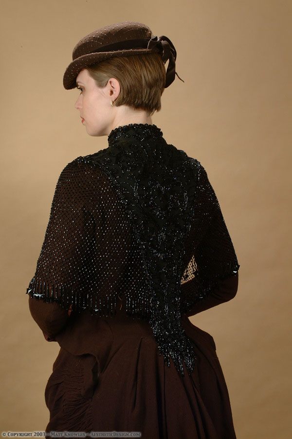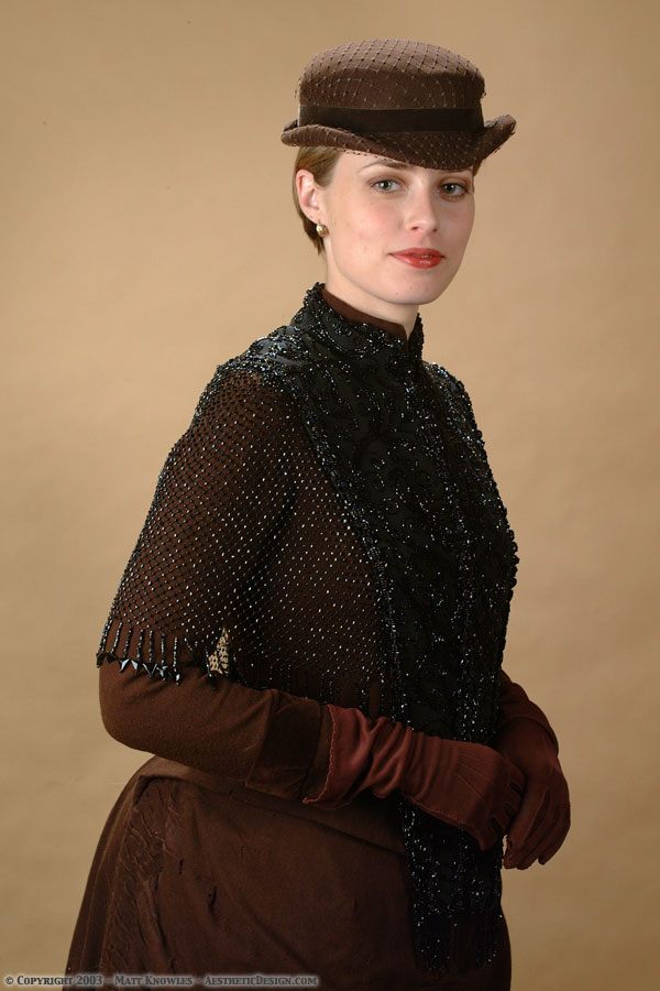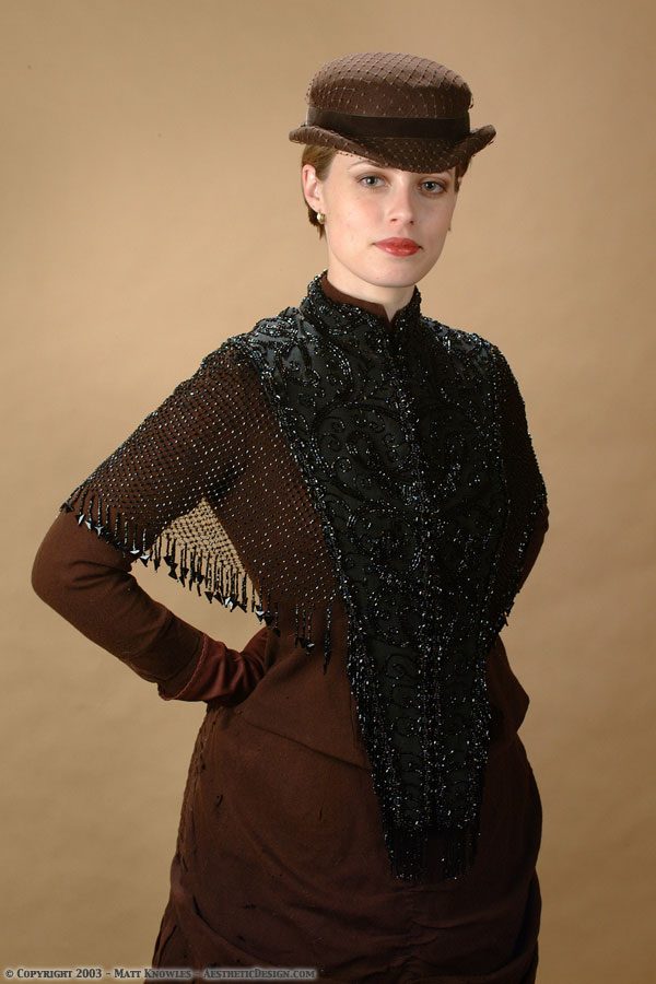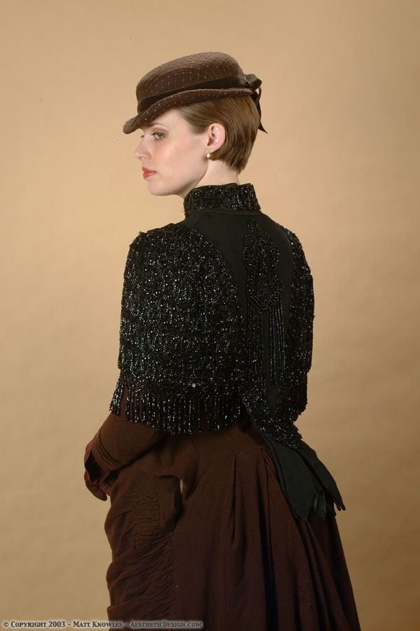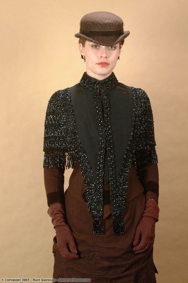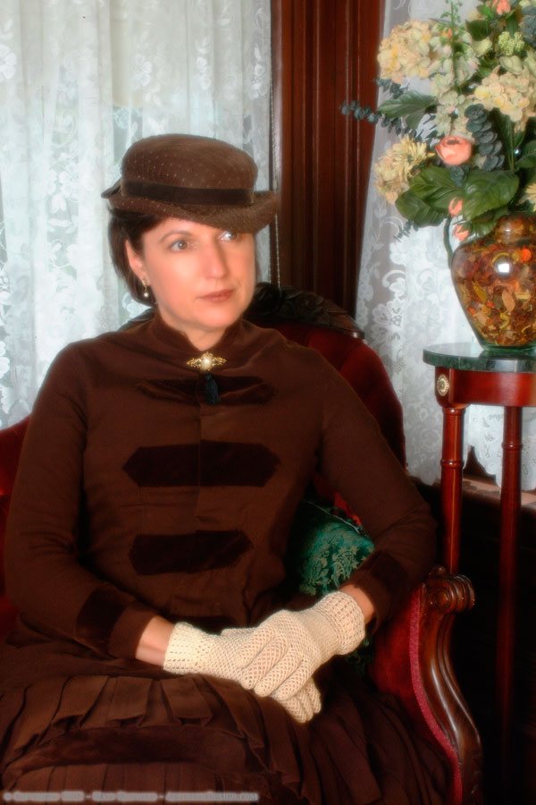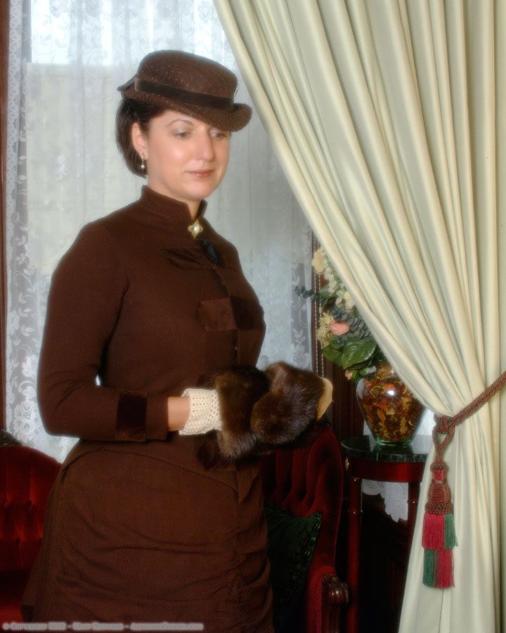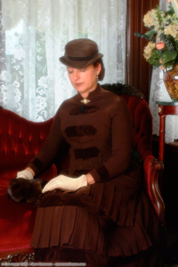 This simple but elegant wool bustle dress looks like it is an ensemble of a bodice, skirt and overskirt, it is really all one piece. The wool dress is accessorized with a brown felt hat (not quite the right vintage, but looks good even so) and a variety of black capelets.