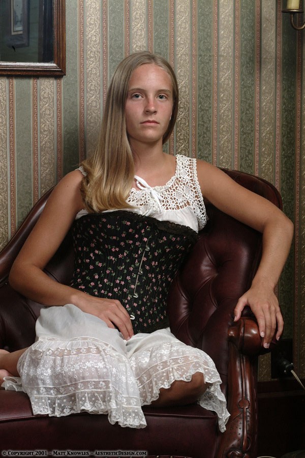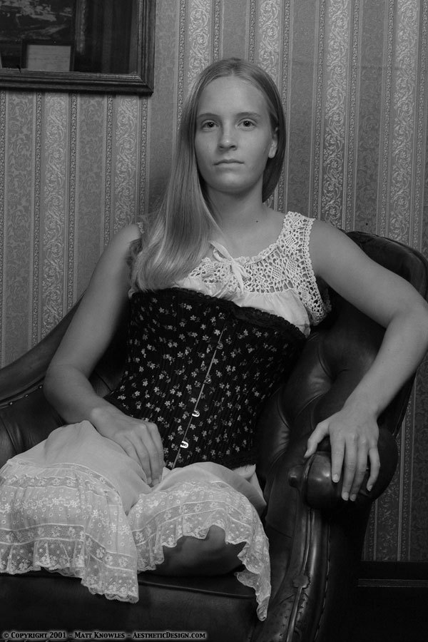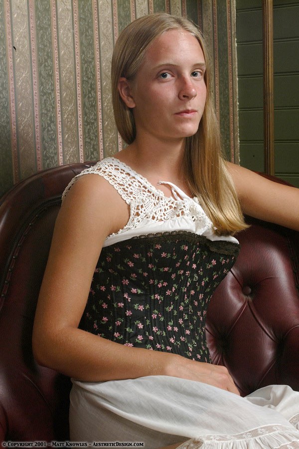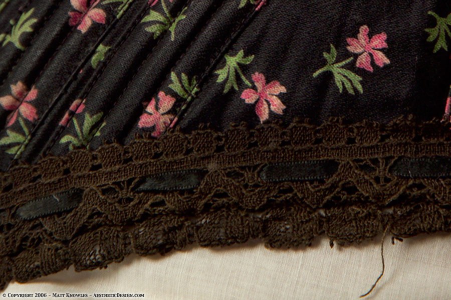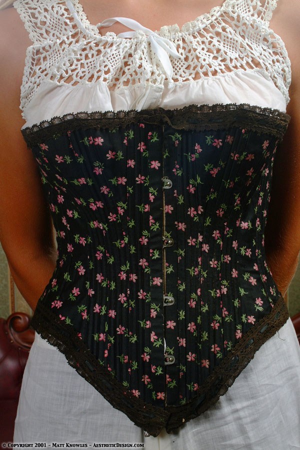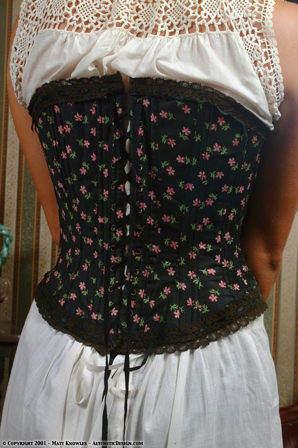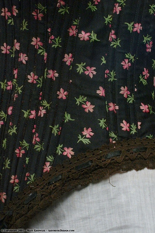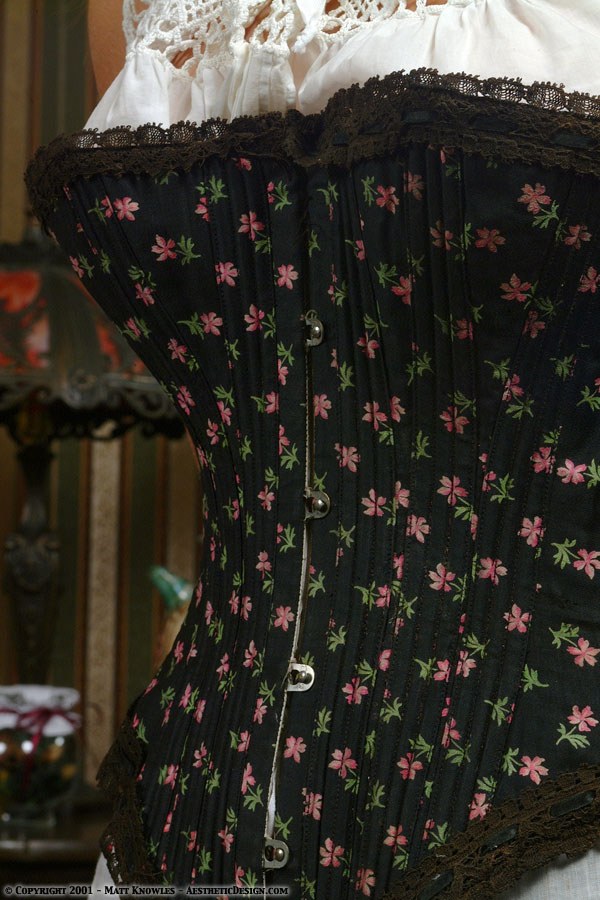 This 1890s corset is made out of black cotton that is printed with a small pink and green flower pattern. There is black lace across the bust and waist.