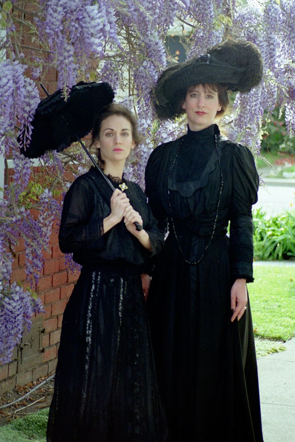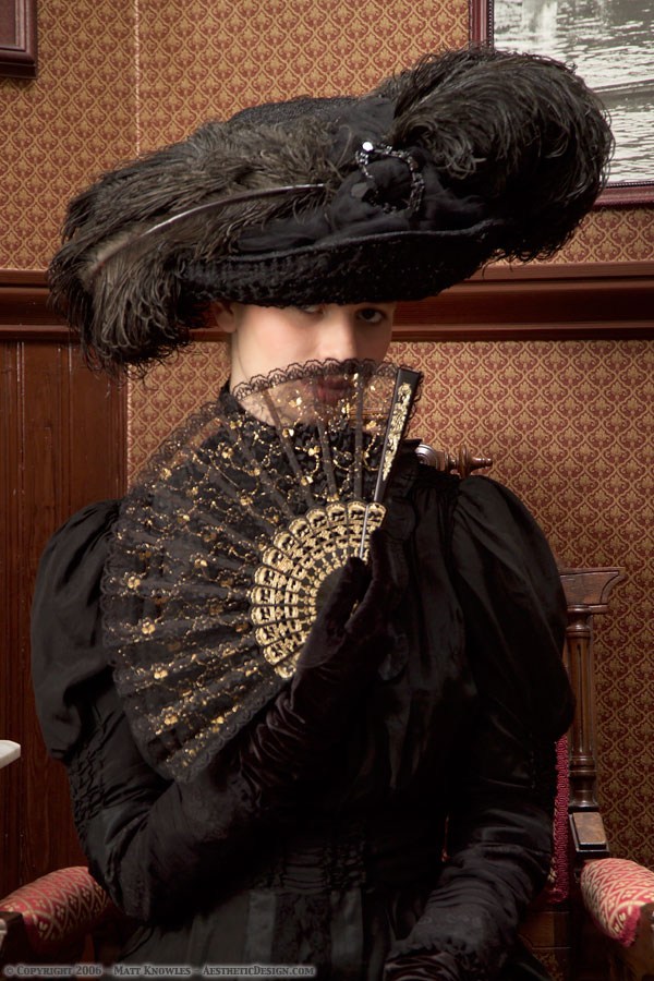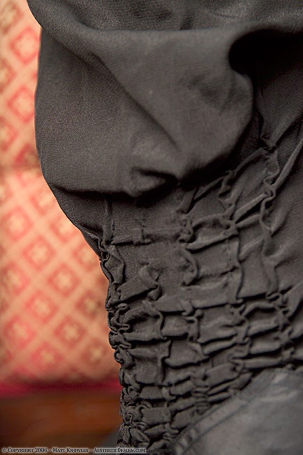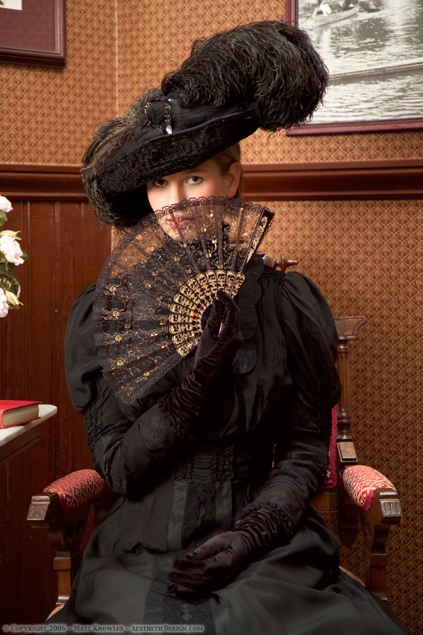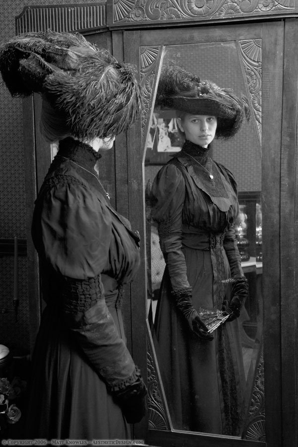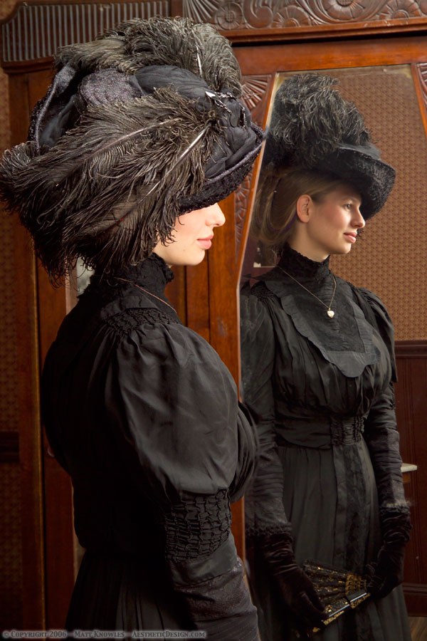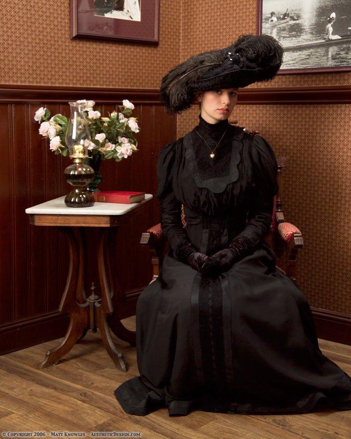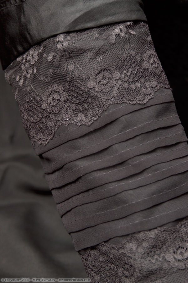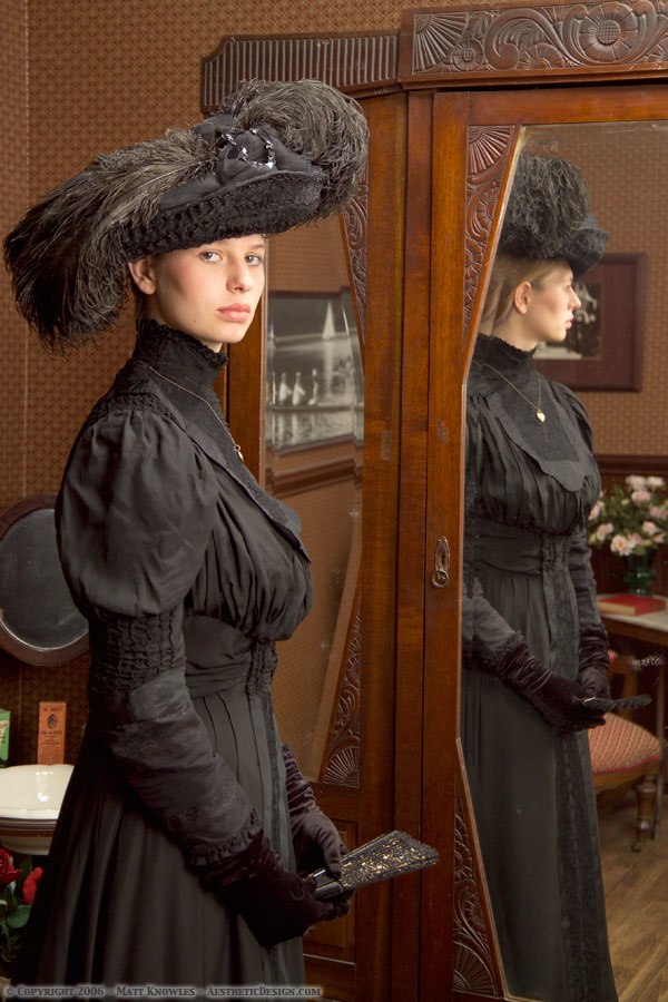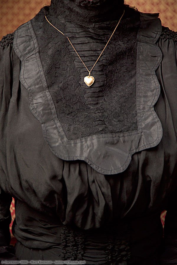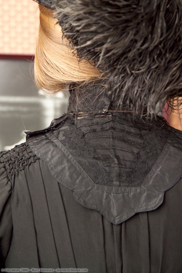 This is the dress that started Lori’s collection. Matt found it in a Los Altos antique store while on a motorcycle ride and seeing that it looked like it was a size that Lori could wear, he took her back to the store. She tried it on and it looked like it would fit her very well. It was hard to tell because the dress needed some restoring and it was hard to tell how it was even supposed to go together. Like many Edwardian dresses, it features many hooks and overlaying panels that make getting into it a chore.