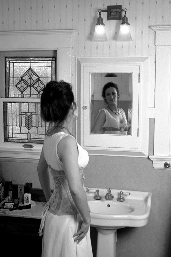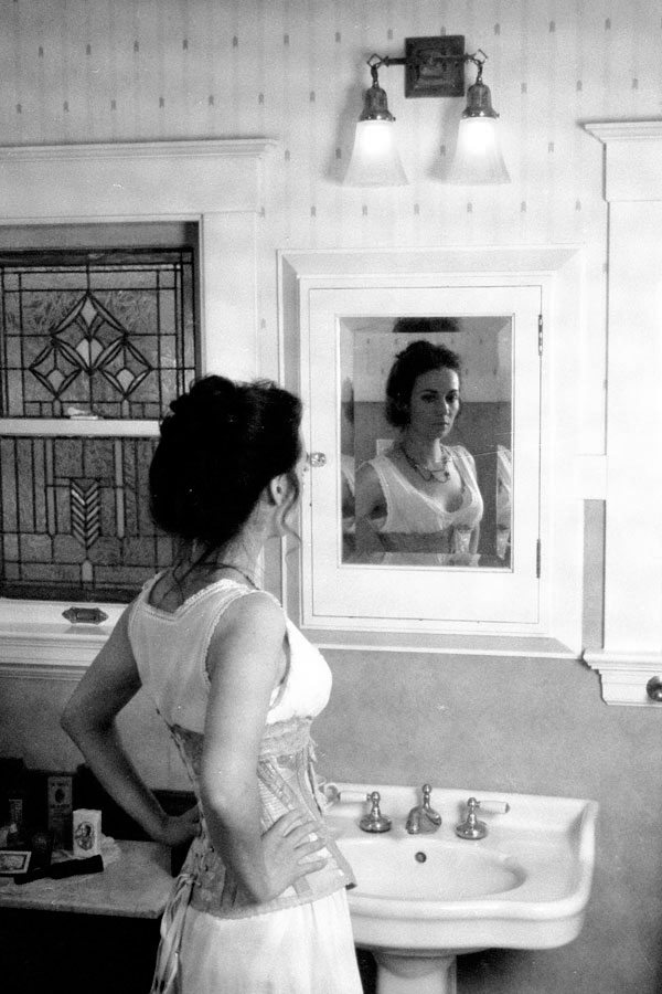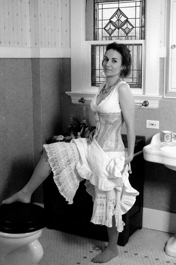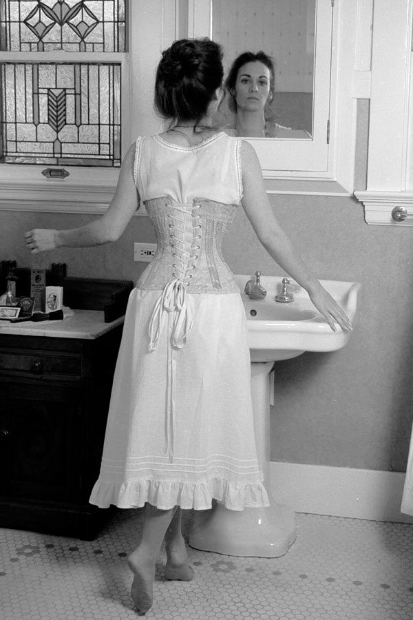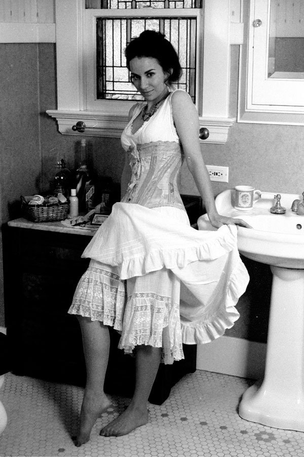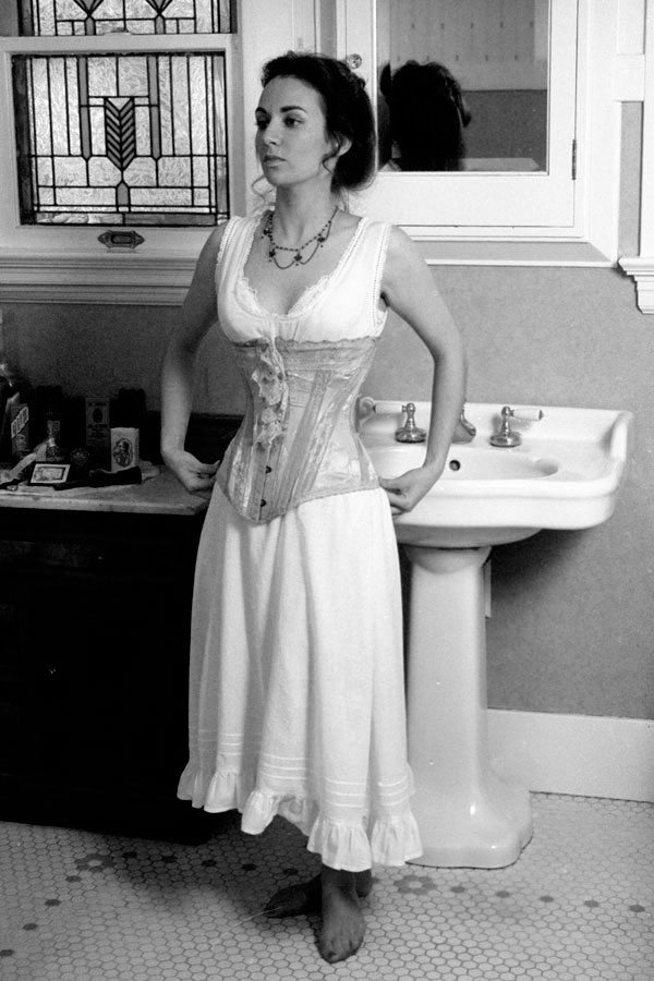 This was one of the first garments we photographed Heather in, who was our very first model. That shoot was on film, using the bathroom of our 1914 bungalow in San Jose as the location.