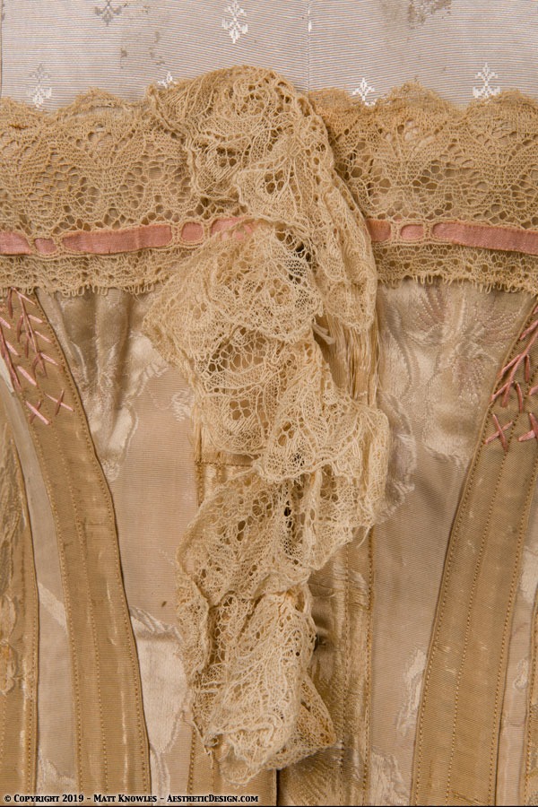 This corset was purchased at the Vintage Fashion Expo held in San Francisco. One of the fanciest examples of a corset that we’ve seen, with a lace ruffle in the front, and pink flossing over the silk fabric. The silk fabric has a jacquard pattern of poppies. There is lace with an inserted pink silk ribbon at the top, along with a lace decoration in the center front.
