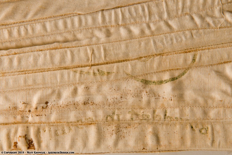 On the inside there is a very faint maker’s mark, but we can’t make out most of the lettering. The style of the corset is French, but the part of the lettering that is visible seems to be ‘di’ which would be Italian.