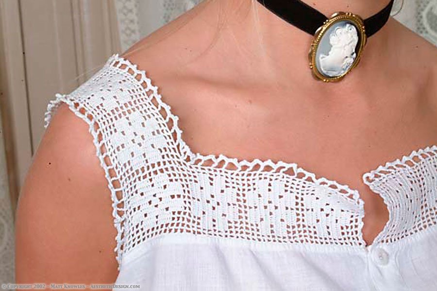 This white cotton corset cover has a crochet lace yoke, and closes with buttons in the front.
