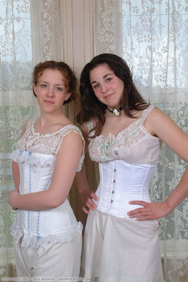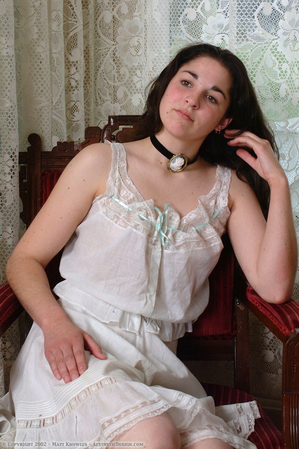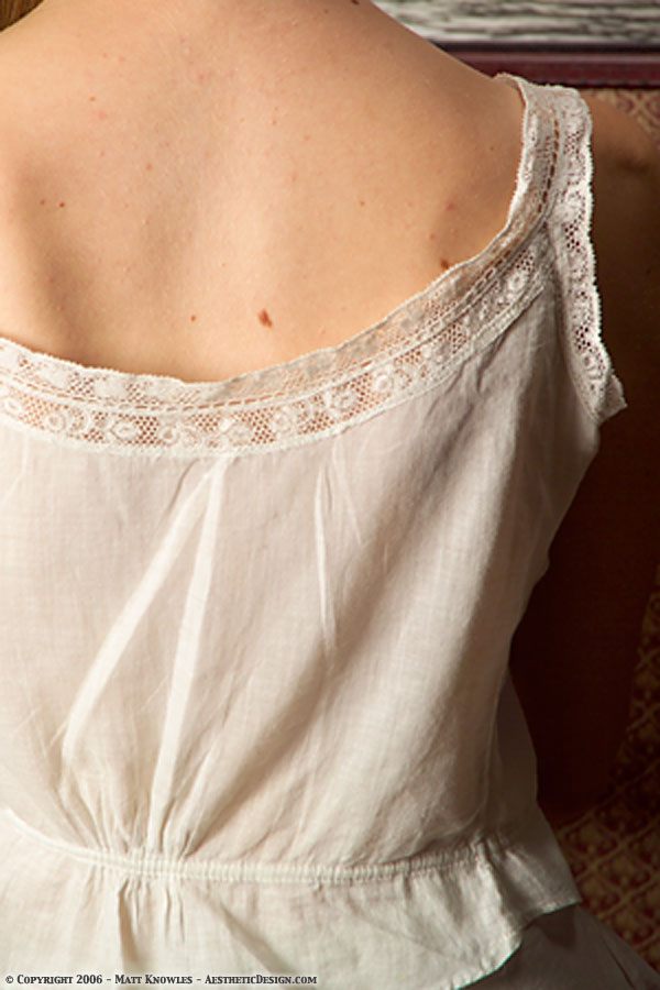 This white cotton corset cover is made of lawn fabric, it has a lace yoke, and closes with buttons in the front and a mint green satin ribbon to gather the front.