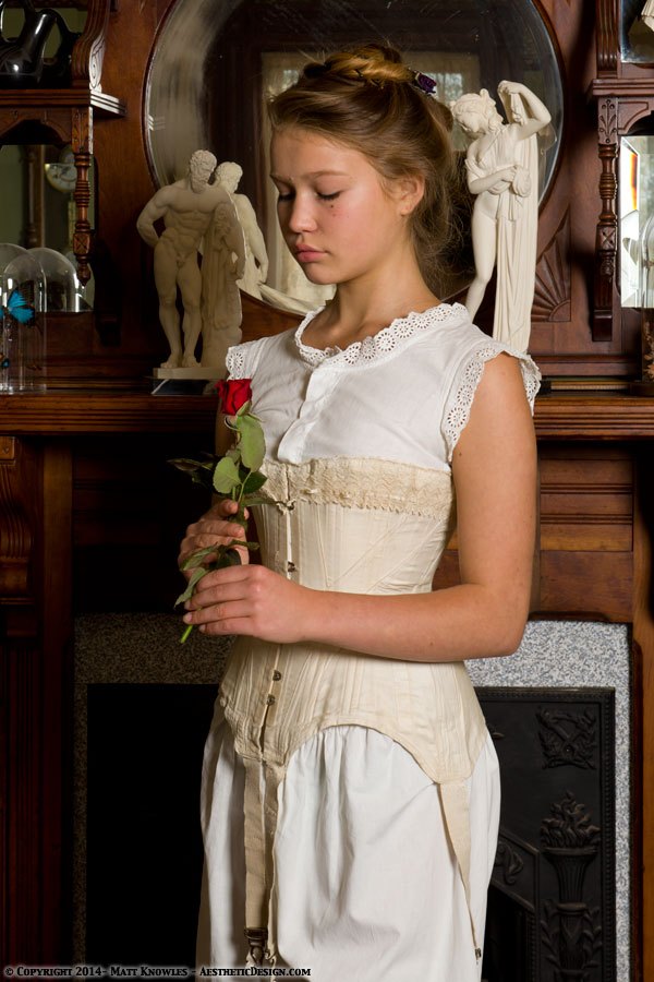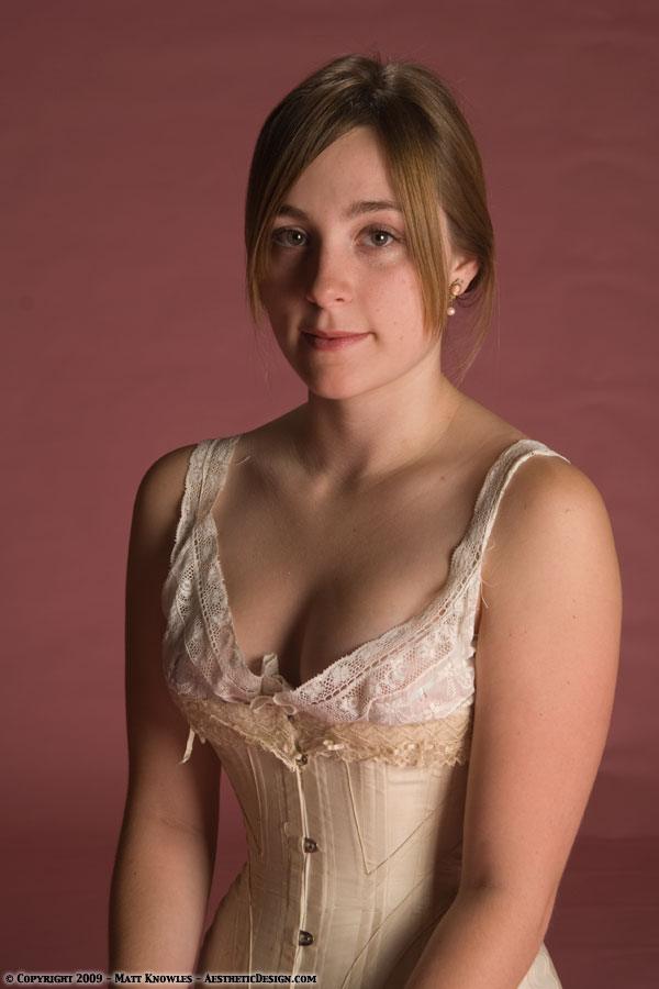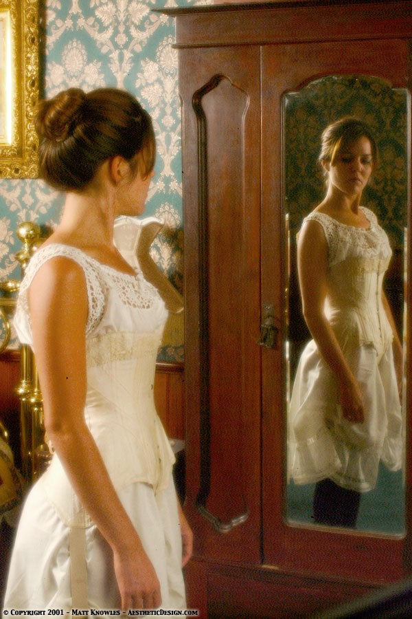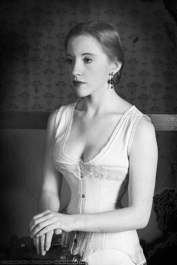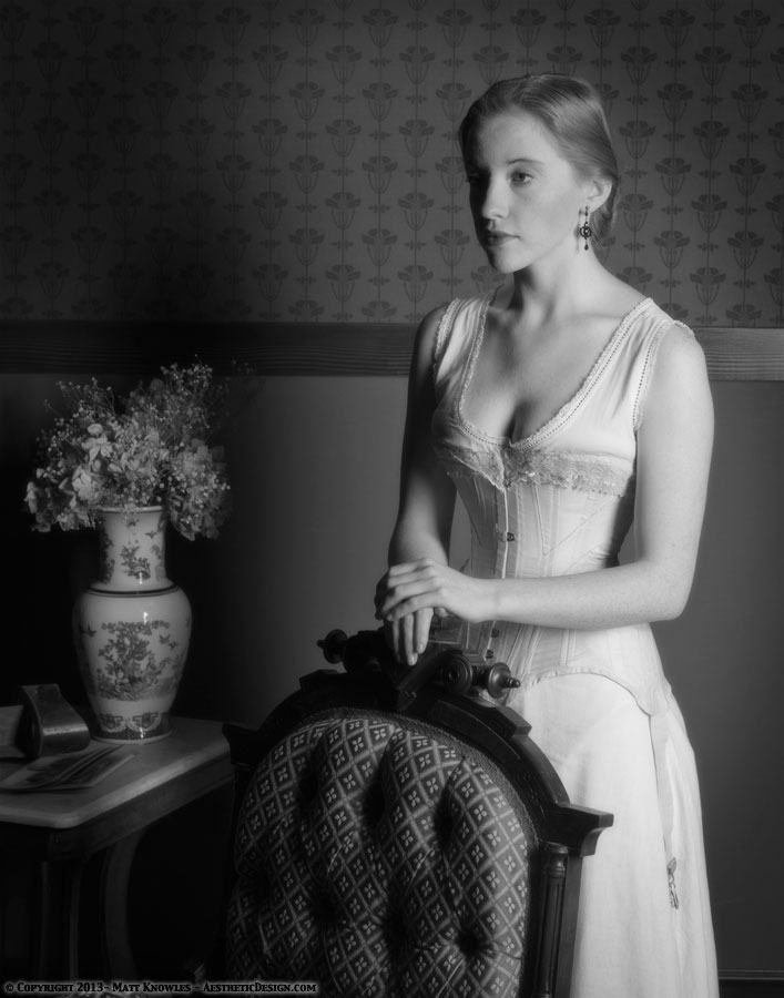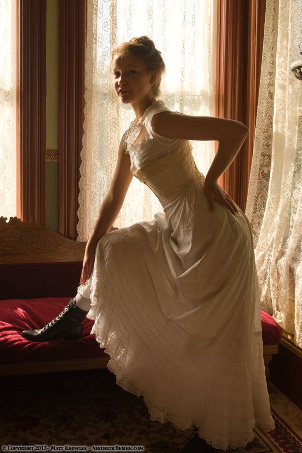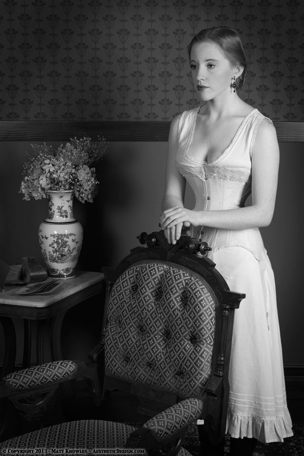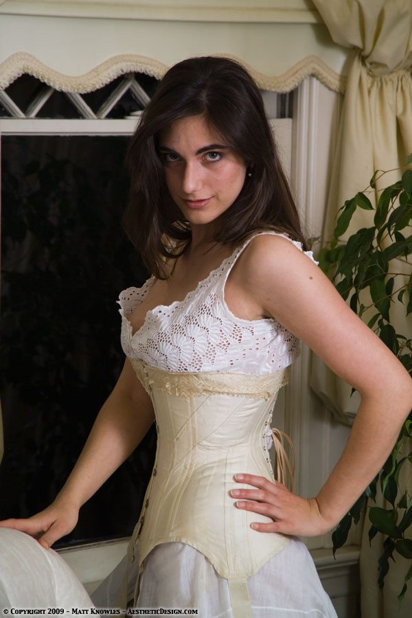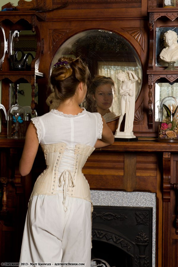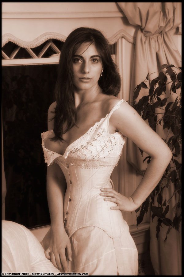 Kelsey, the model in the second shoot of this corset received a true life history lesson during the shoot. This was Kelsey’s first experience wearing a corset, and we cinched her waist from her normal 24″ to about 22″ so that she could fit into the 1898 Wine Ensemble. We took these shots of the Victorian lingerie and corset, and then as we were helping her into the bodice and skirt, she started getting dizzy and nauseous. We didn’t have a fainting couch nearby, and no smelling salts were available, so we quickly got her out of the corset and got her outside for some fresh air. Once she recovered we got her dressed again and she looked fantastic.