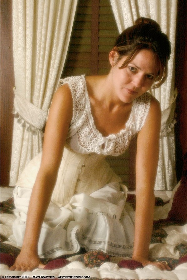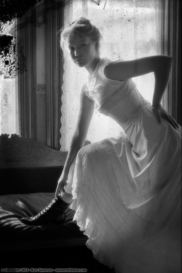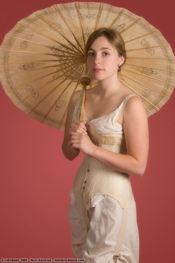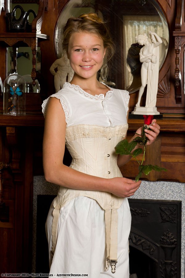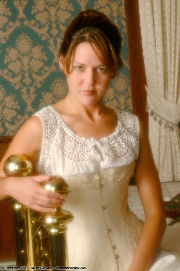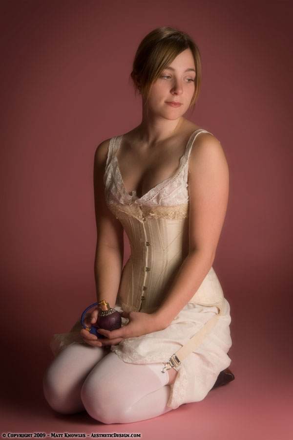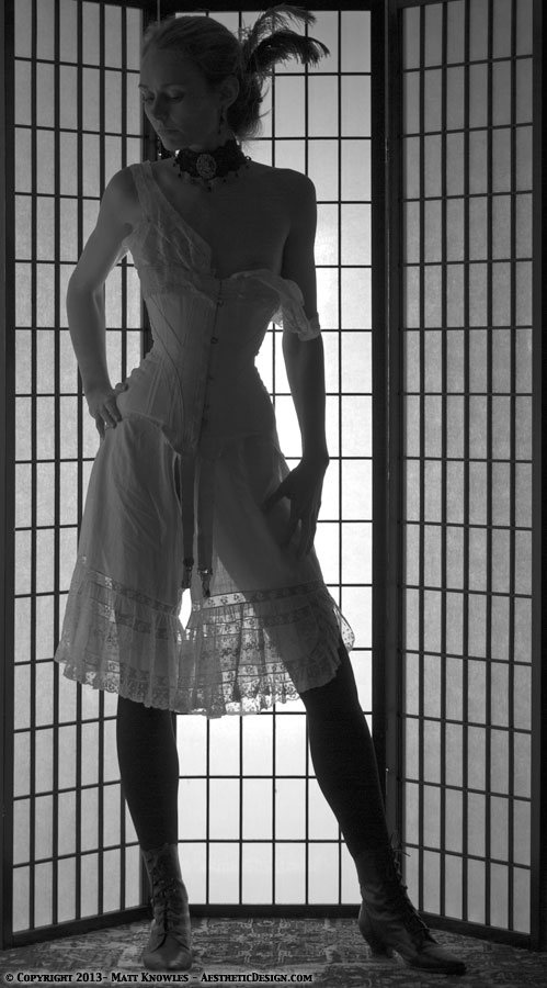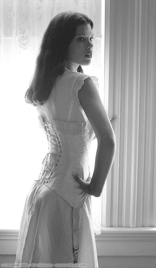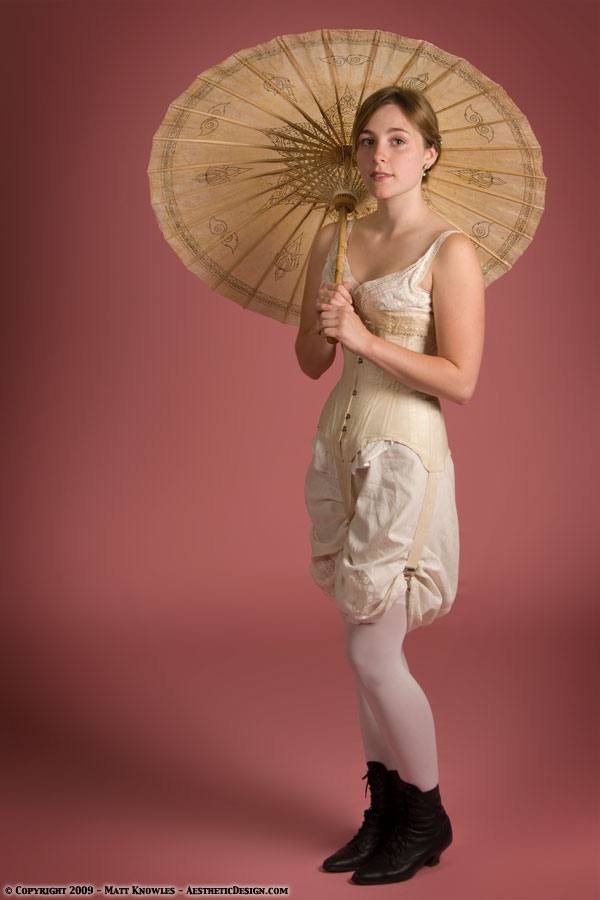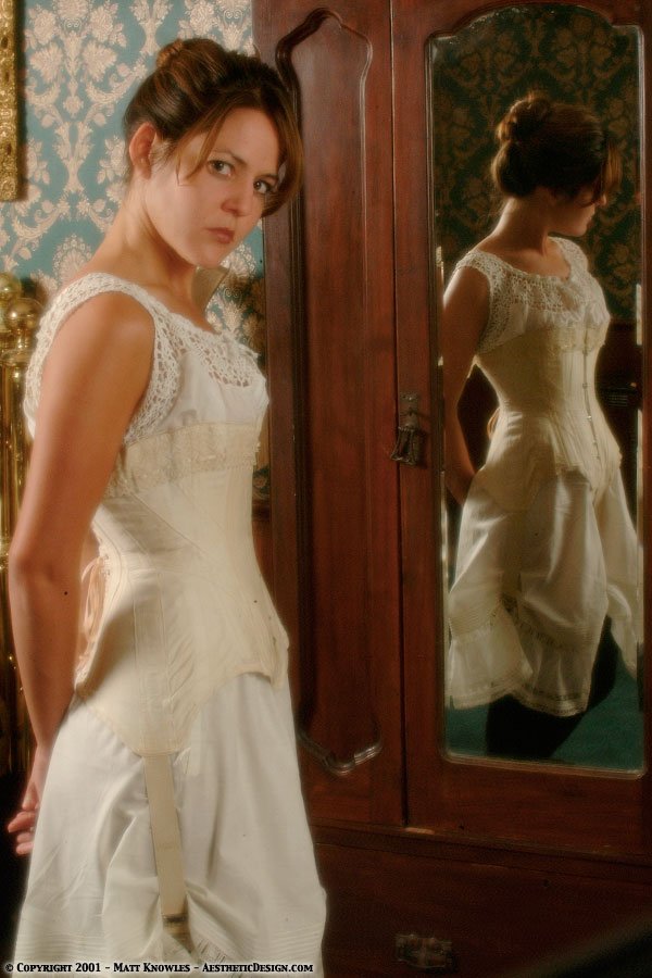Kelsey, the model in the second shoot of this corset received a true life history lesson during the shoot. This was Kelsey’s first experience wearing a corset, and we cinched her waist from her normal 24″ to about 22″ so that she could fit into the 1898 Wine Ensemble. We took these shots of the Victorian lingerie and corset, and then as we were helping her into the bodice and skirt, she started getting dizzy and nauseous. We didn’t have a fainting couch nearby, and no smelling salts were available, so we quickly got her out of the corset and got her outside for some fresh air. Once she recovered we got her dressed again and she looked fantastic.