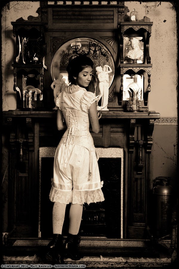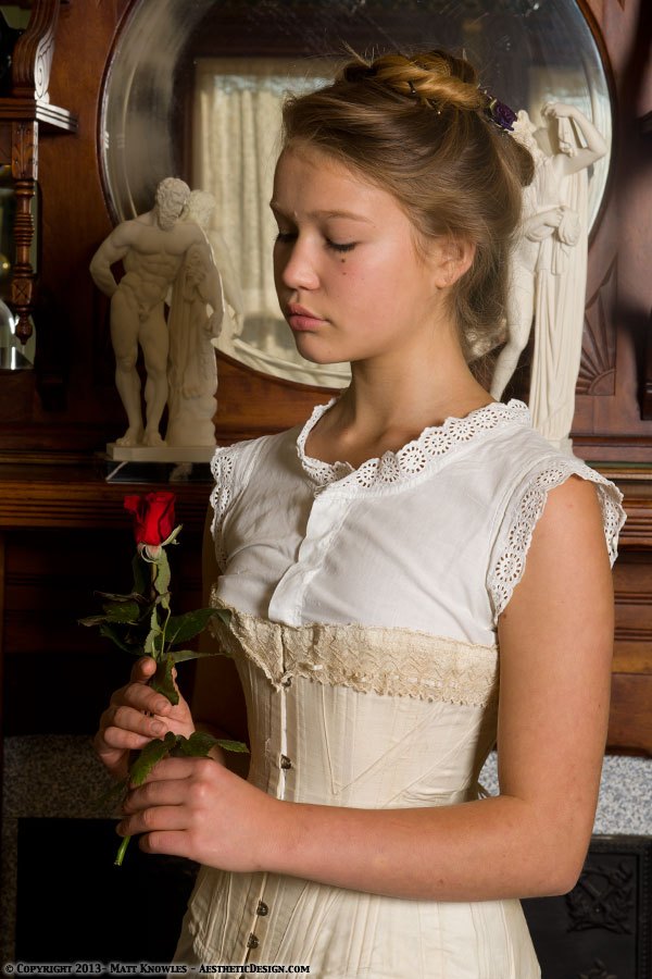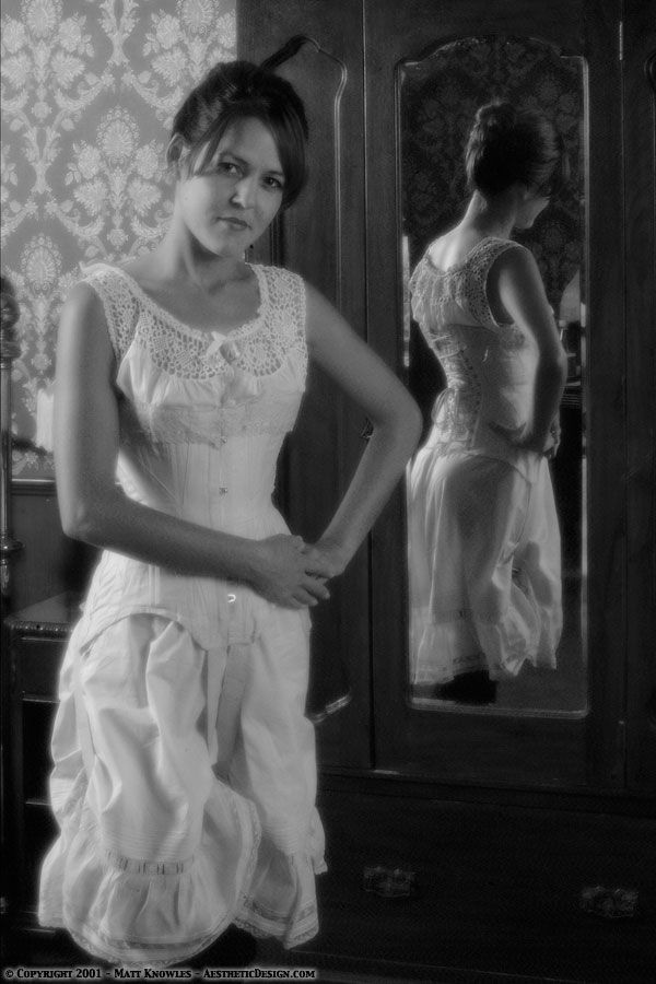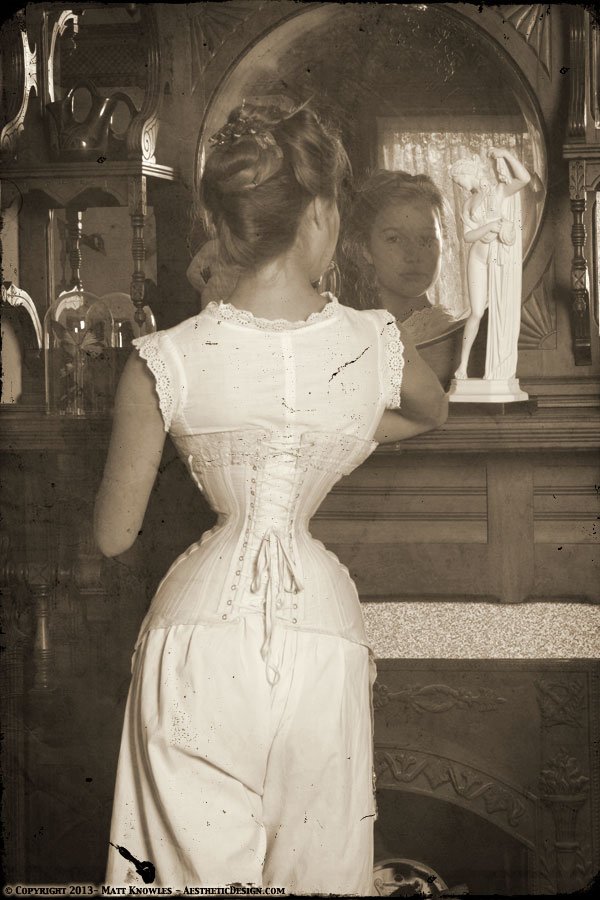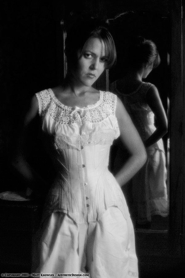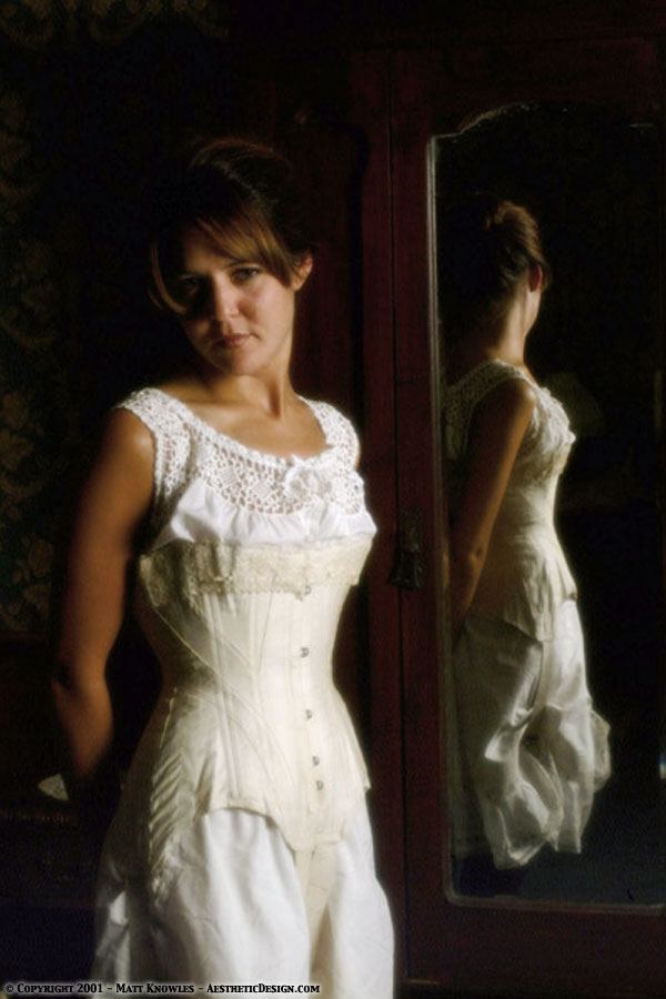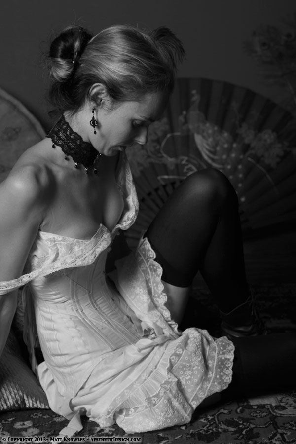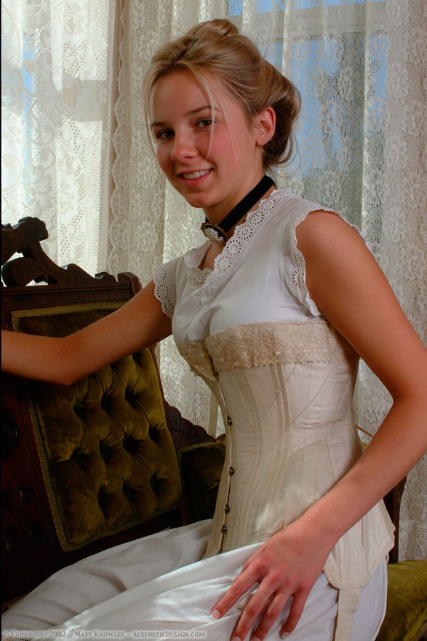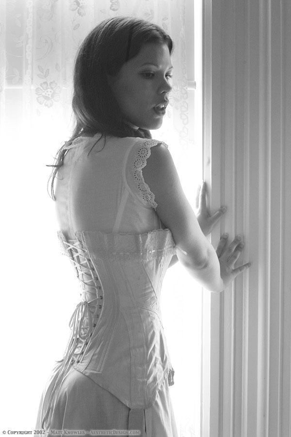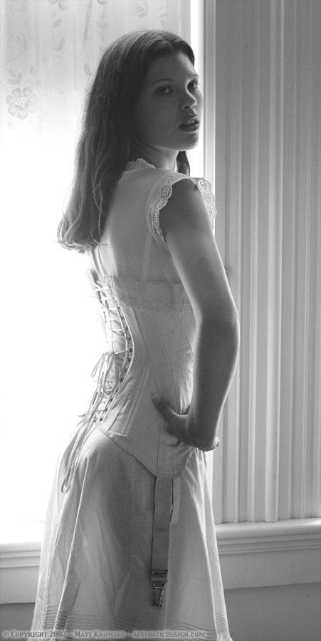 Kelsey, the model in the second shoot of this corset received a true life history lesson during the shoot. This was Kelsey’s first experience wearing a corset, and we cinched her waist from her normal 24″ to about 22″ so that she could fit into the 1898 Wine Ensemble. We took these shots of the Victorian lingerie and corset, and then as we were helping her into the bodice and skirt, she started getting dizzy and nauseous. We didn’t have a fainting couch nearby, and no smelling salts were available, so we quickly got her out of the corset and got her outside for some fresh air. Once she recovered we got her dressed again and she looked fantastic.