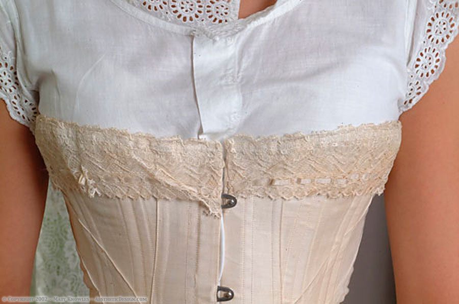It is one of two almost identical c.1905 corsets in the collection. They can most easily be identified in photos by the busk. This corset was manufactured by Royal Worchester, and the busk has two closely spaced pins at the bottom. The waist when fully closed is 19″. Matt found this corset in an antique store in Redding for only $25!