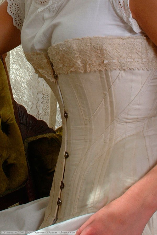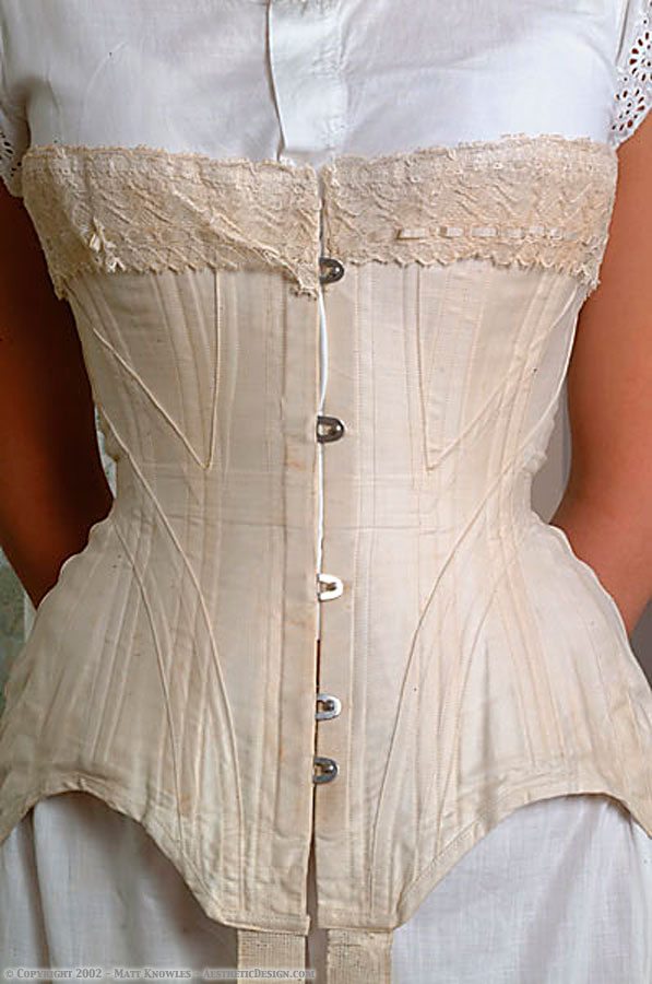 This garment is probably the most photographed in the collection, simply because it is required for a lot of the other pieces to be able to fit and have the proper profile. It’s also one of the sturdier corsets in the collection, and is sized right for the tiny models we need for many of the Victorian and Edwardian garments.