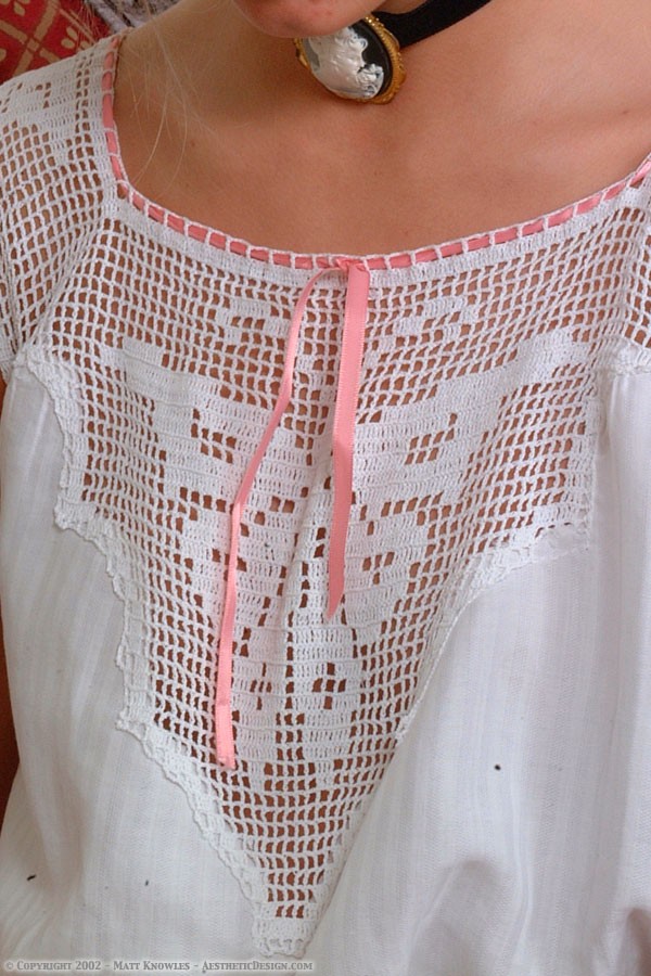 This cotton camisole features a crocheted yoke with a large butterfly in front and smaller butterflies on the shoulder straps and in back. A pink satin ribbon is embedded in the lace around the neckline. The cotton fabric has a subtle striped pattern.