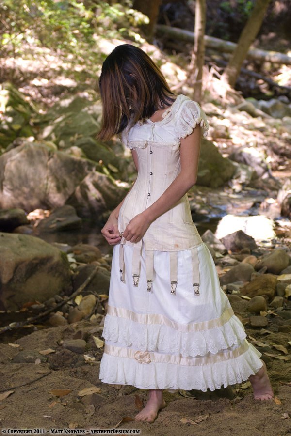 This is a corset I thought we would never photograph on a live model due to it’s 18″ waist. However, Sakura Blossom’s super petite body allowed us to finally get rid of the photo of this corset stuffed with a pillow. The second model, Hope, is very petite yet even with the laces let all the way out it was a struggle getting her into it. Matt photoshopped one image of Hope to give an idea of what this corset must have looked like if it were cinched close to what it was made for.