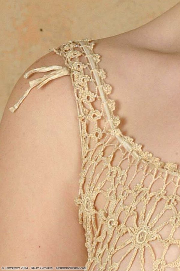 This chemise is very similar to modern t-shirts. It has a crocheted neckline with ribbons at the shoulders and it ties in the center.