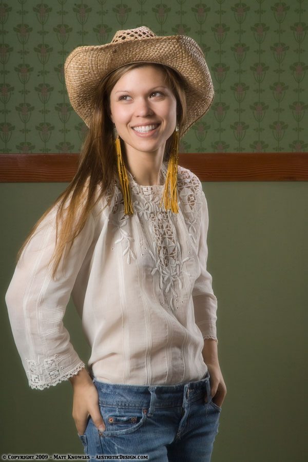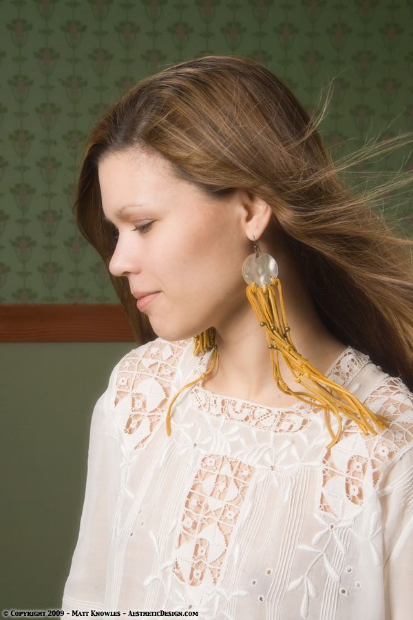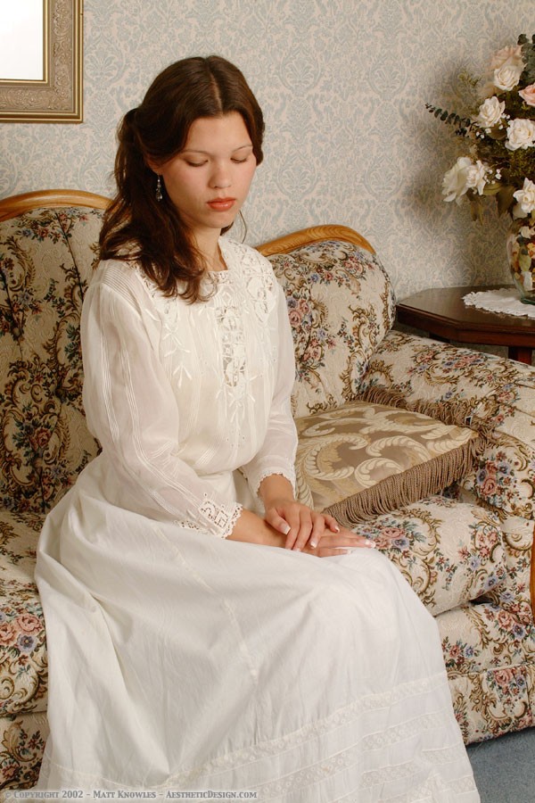 An excellent example of an Arts and Crafts period textile, this blouse features the Glasgow Rose design that was popularized by Charles Rennie Mackintosh. We photographed this blouse during the first shoot we did with Katy, which was at the Victorian Inn. As she became one of our go-to models for the petite clothing we did a number of shoots with her, and we gave her this blouse as a wedding present. Seven years after the first shoot she returned to the studio to do another shoot with the blouse.