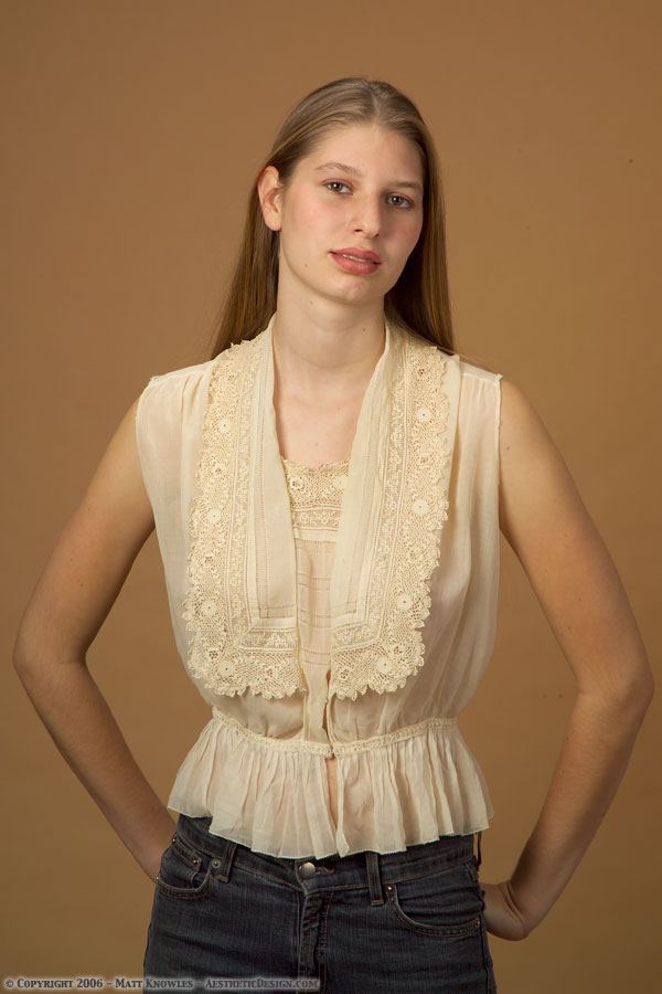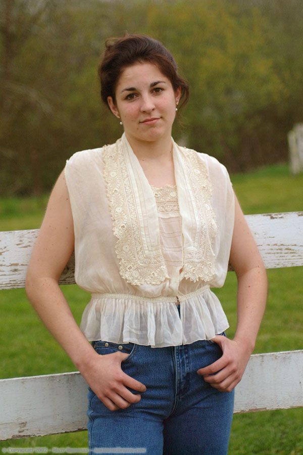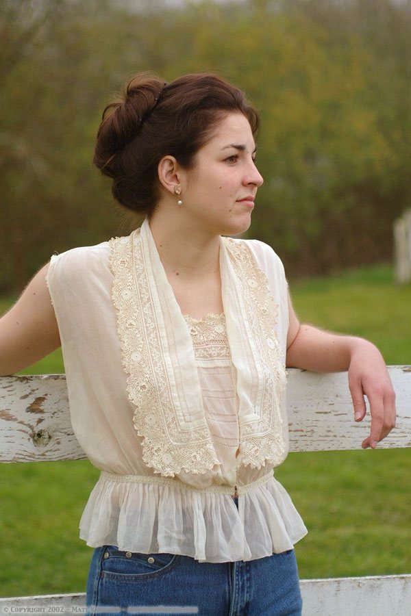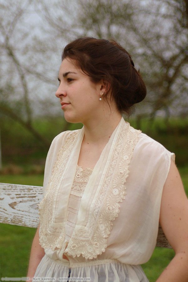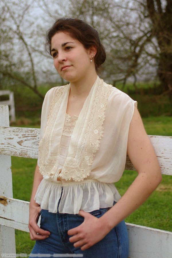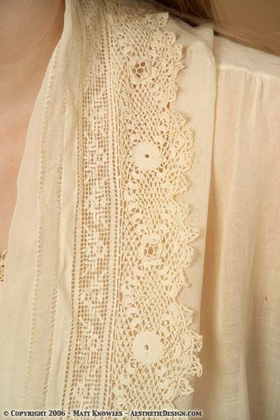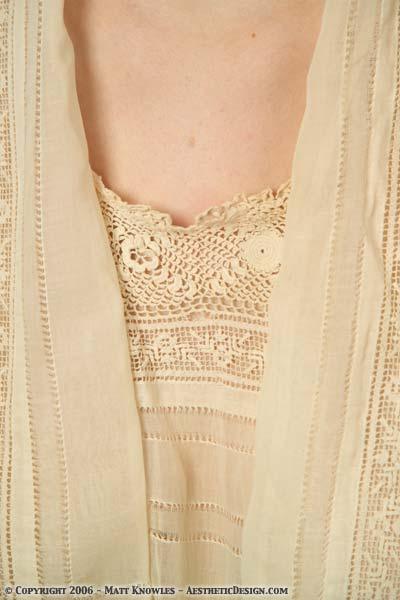 This blouse may originally have had sleeves, or it may have been worn underneath a jacket. Made of sheer cotton, it has fine crocheted lace that makes up the sailor collar.