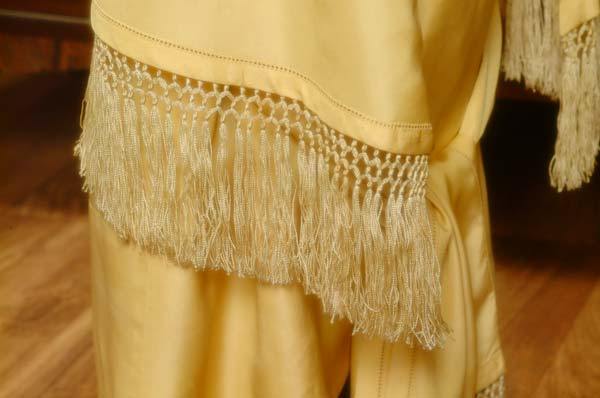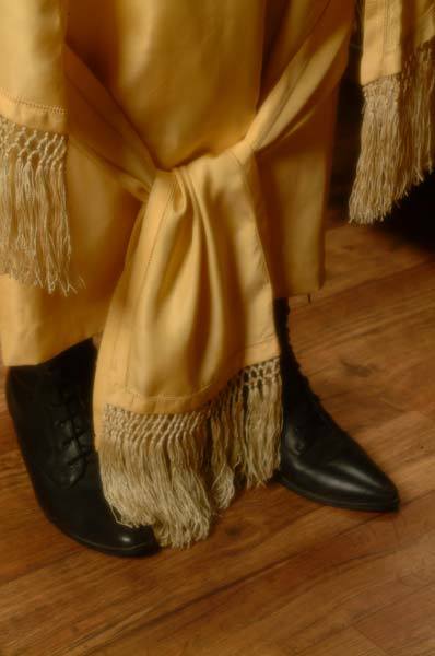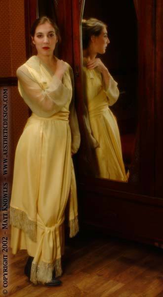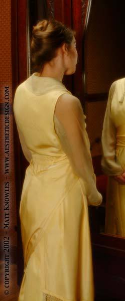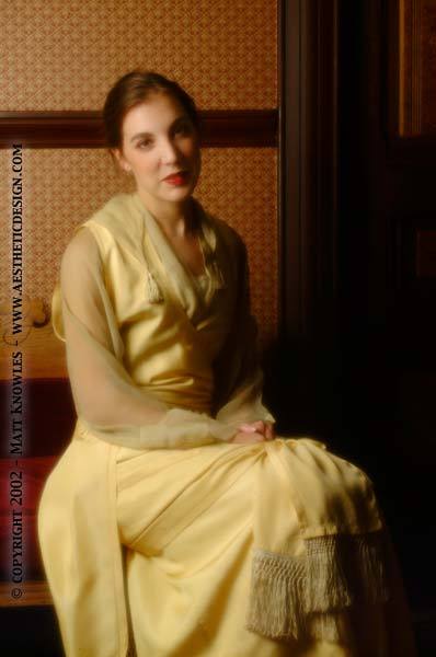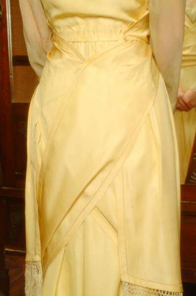 This is one of those Edwardian dresses that should have come with instructions on how to wear it. In trying it on a mannequin when we first got it, we were a bit baffled, coming up with several ways it could go together. It is quite involved with many hidden hooks and snaps, but we think we narrowed it down to two choices. In the first shoot, Danah models it with the tails wrapped around the front. This is probably the way it was worn. In the second shoot, Margo shows how it would look with the tails worn as a train.