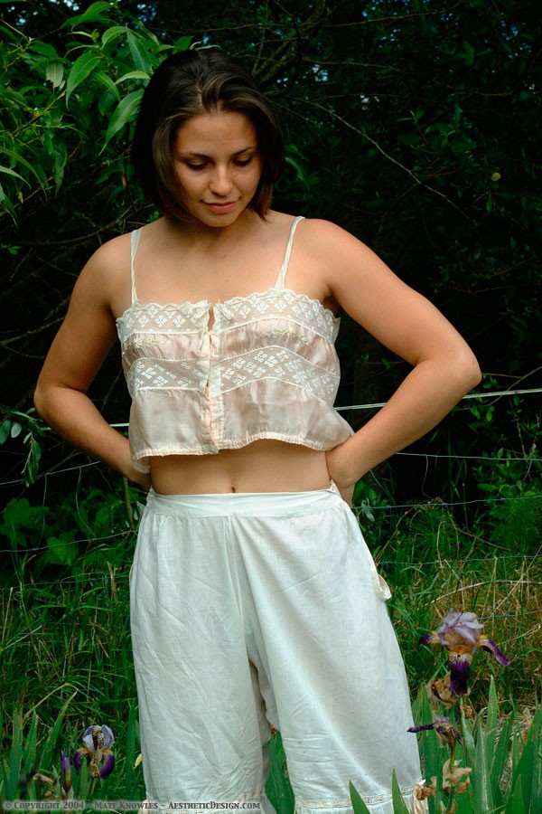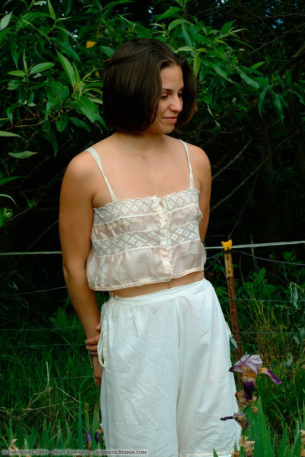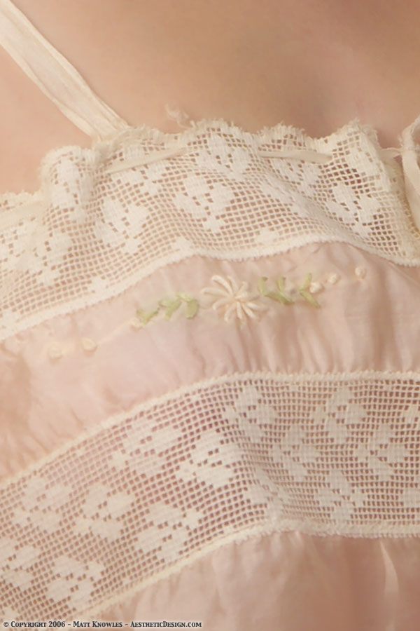 This camisole is constructed from silk crepe and fine lace. The front is detailed with a pink and green floral design over each breast. It buttons up with three mother of pearl buttons, and has an inserted drawstring at the top.