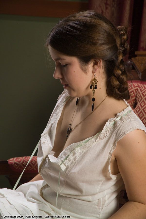 Katy modeled this chemise in our studio with a reproduction corset. We have a 1915 corset in the collection, but we needed the power of this corset to get Katy into the 1900 Black Silk Ensemble that she wore later in the session.