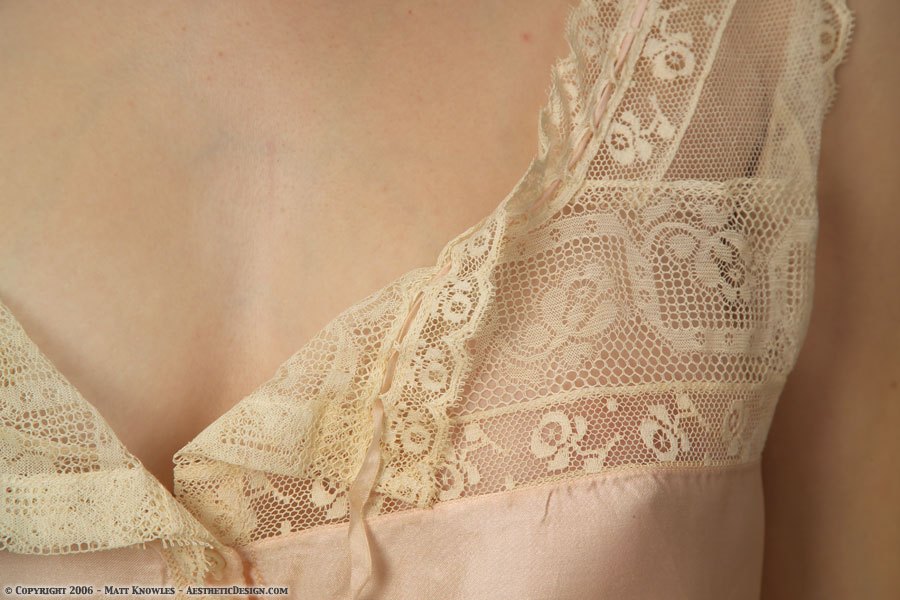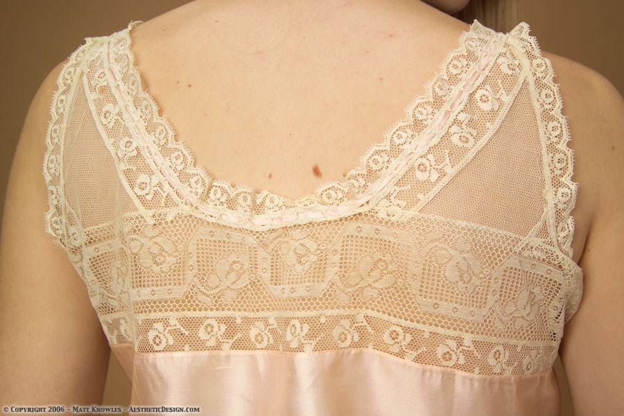 This beautiful lacy camisole buttons up the front with mother of pearl buttons, and ties at the top with a ribbon. The yoke is constructed from several different floral laces. There is also a band of lace at the bottom hem.