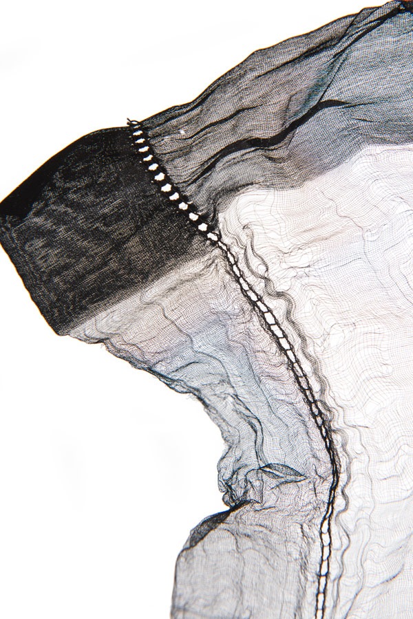 Made out of very sheer silk chiffon, with only the slightest decoration in the border. One article about 1930s shawls we came across mentions ladder stitching, although it doesn’t show any photos of what is meant by that term, and we couldn’t find use of the term anywhere else. But it’s easy to imagine calling the hem treatment shown in the detail photo as ladder stitching due to it’s open spacing.