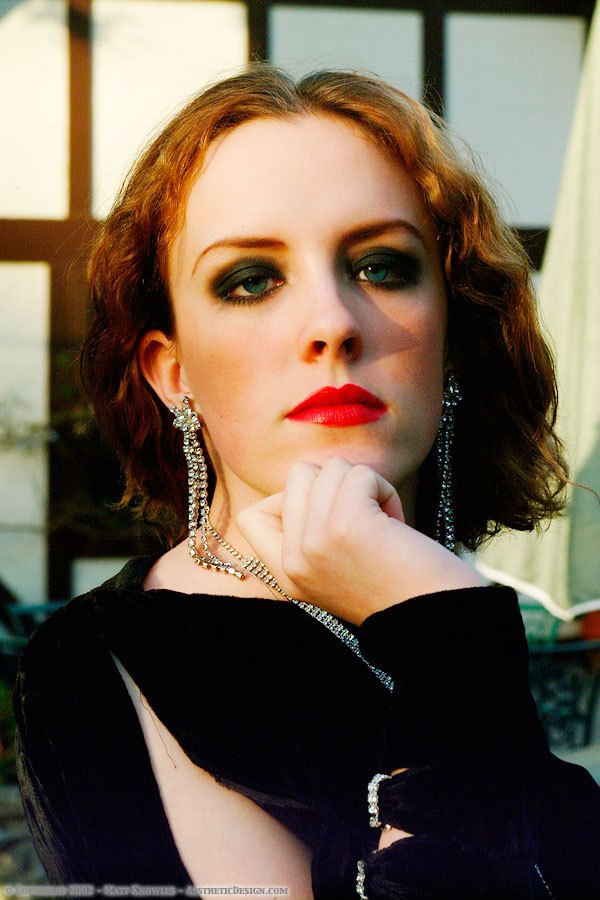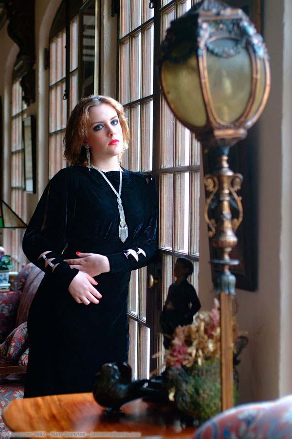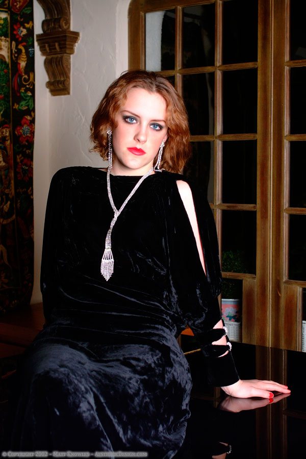 This dress is also one of the hardest to photograph. Matt uses black velvet in the studio when he wants a solid black background, as black velvet is great for not reflecting any light. That makes it hard to light it to show the detail, without blowing out the model.