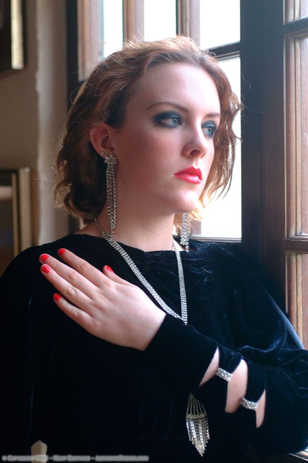 The ultimate sexy, slinky dress; black velvet in a curve hugging, bias cut and accented with cut-out sleeves and rhinestone bands. When we did the fashion show at the Ingomar Club, the audience gasped when this dress was revealed. 10 fabulous Victorian and Edwardian outfits proceeded it, and yet this one got the most audible reaction from the audience.