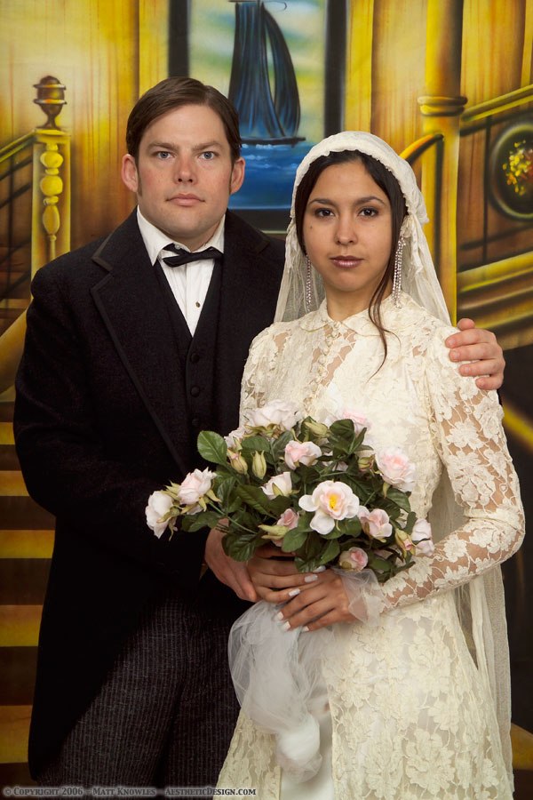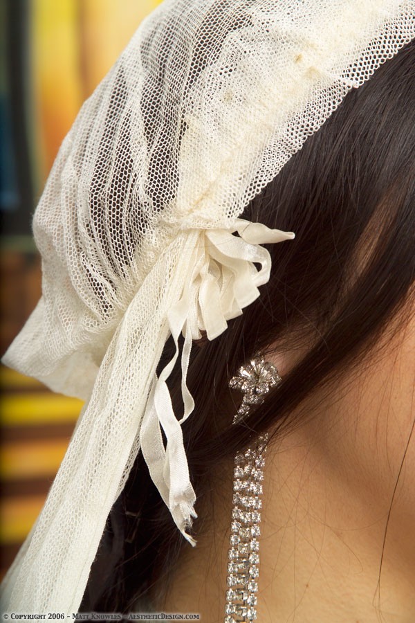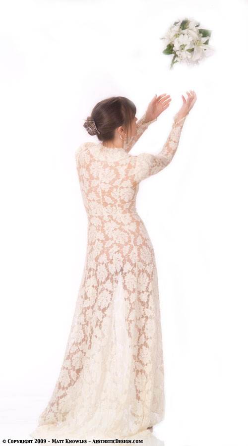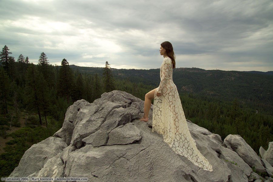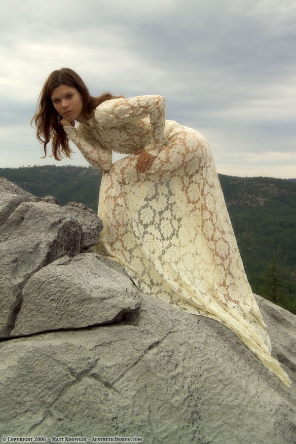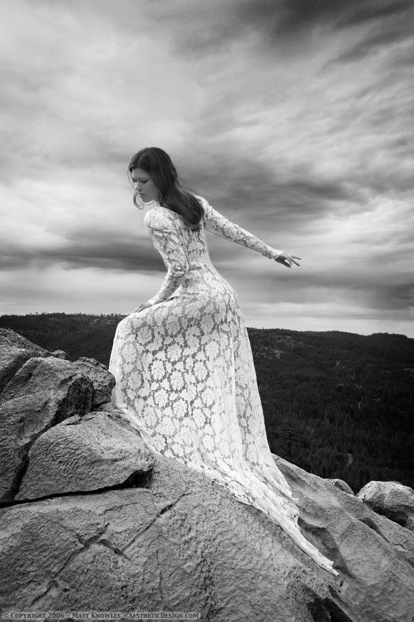 This wedding dress is featured in Matt’s favorite photograph, the one of Katy wearing it on top of the mountain with a stormy sky in the background. Entitled Mountain Peek, a pun on the see-through nature of the lace dress, the photo almost didn’t happen. Being up on a mountain top while a summer storm was approaching didn’t seem like a good idea, but Katy talked Matt into going ahead. He’s glad she persisted, because it ended up being a great photograph.