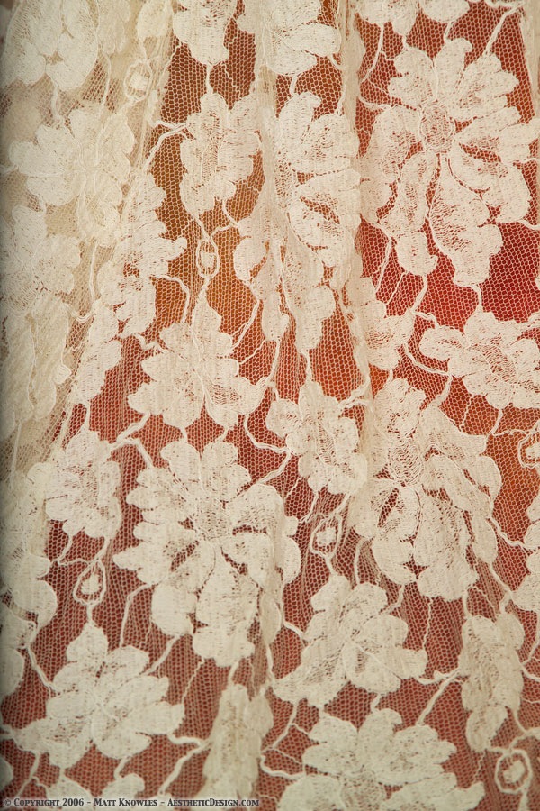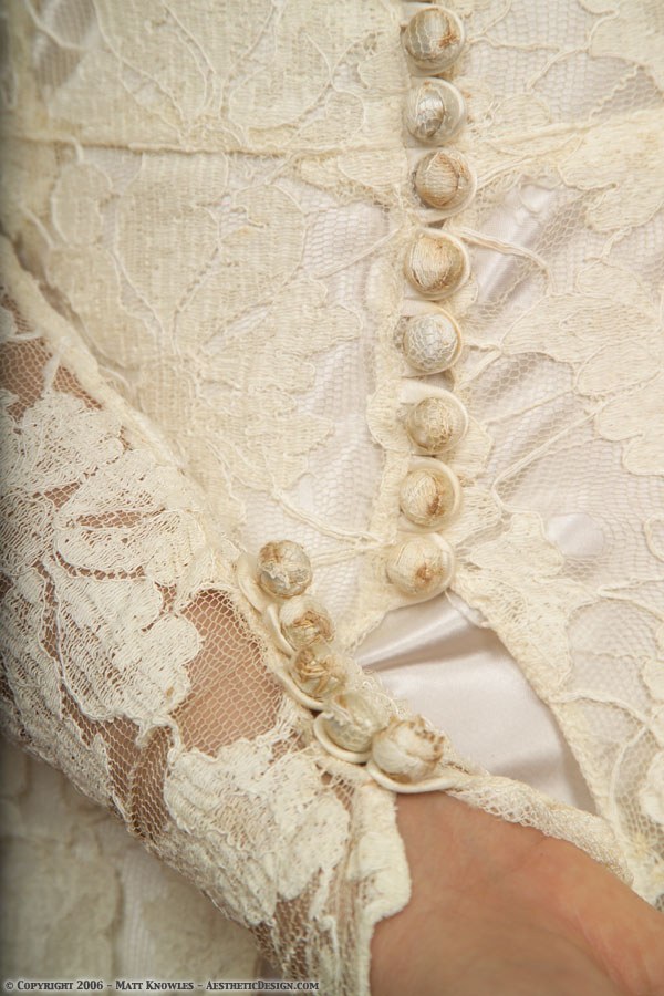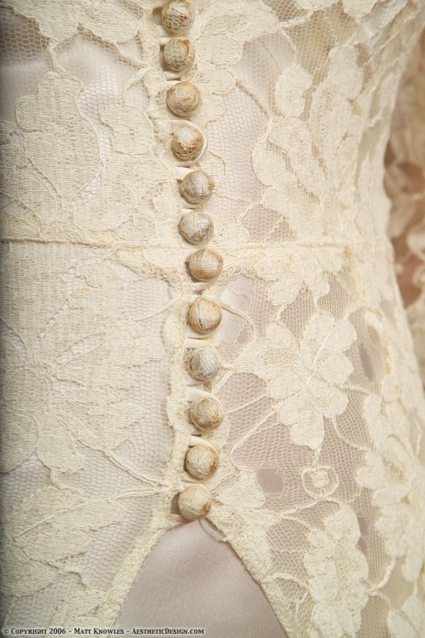 This lace wedding dress is part of what would have been a two piece wedding dress. The front buttons up with a long series of fabric covered buttons, but the front of the skirt is very open so it would have been worn with an under layer that was meant to be seen. When Matt saw this dress on Ebay, the seller also had a 1930 Ivory Silk Dress for sale, and it makes a great companion to this dress.