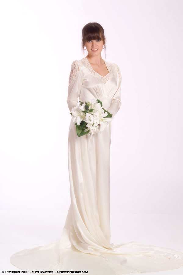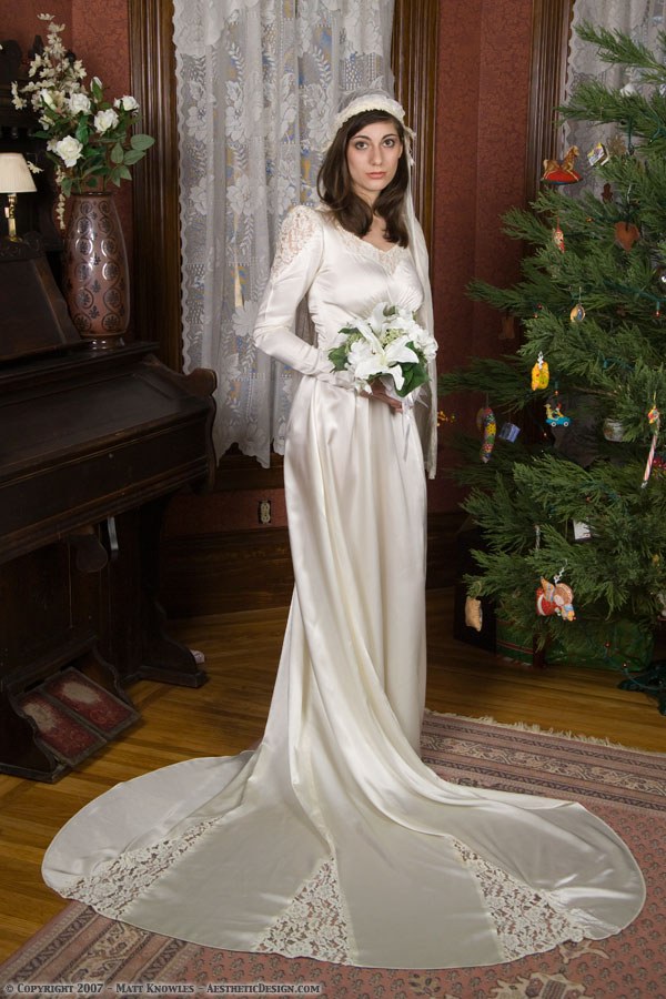 This silk wedding gown from the 1930s features a bias design that buttons up the back with dozens of buttons. The yoke, sleeves, and train feature a beautiful lace design.