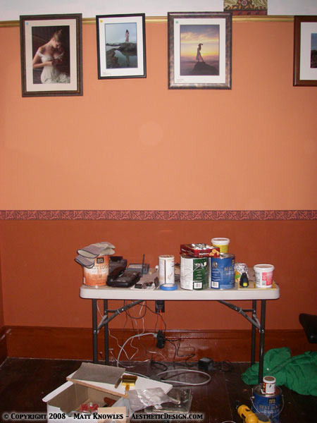 Lori’s hearing problem has caused many changes in our household, and we’ve figured out ways to work around most of the problems that it causes. Hanging wallpaper isn’t one of them. It’s very hard to do sign language when both hands are holding a strip of wallpaper. It’s also impossible to be close and in front of her when we both need to be at opposite ends of the wall. So hanging this border didn’t go as smoothly as our past wallpapering projects. Fortunately, this was the longest piece that needed to be put up and the rest I’ll be able to handle by myself.