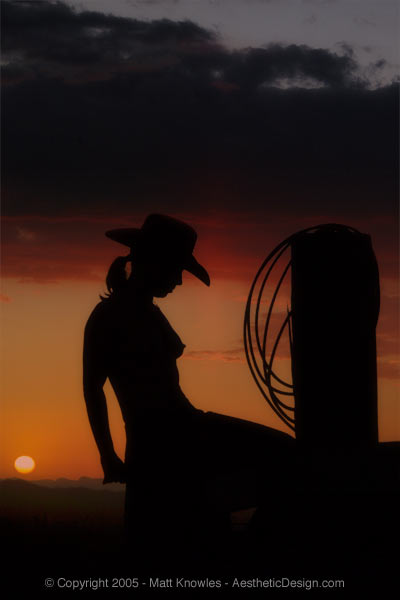 This photo of Katherine is another bit of Photoshop trickery. Last summer during our trip to the White Mountains, I photographed some real pretty sunset pictures of the ancient bristlecone trees silhouetted against the sky. I also took some pictures of just the sky in case I ever needed a killer sunset to merge with another photo. So this photo presented just that opportunity. The silhouette, sun and hills come from the shot in Loleta, and the sky and clouds are from the White Mountain shot.