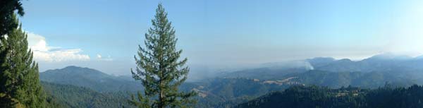 Yesterday, going to work the weather looked like the fog was burning off and it was going to be another nice day. I had a meeting in Rio Dell and during the drive over it started clouding up and just as I arrived it started sprinkling. Then during the meeting it started thundering and the rain came down in buckets. After about 30 minutes of that my fire department pager went off, announcing that there we were needed for some mutual aid in Honeydew. I got back to Ferndale to find a crew had been assembled. Today I got a wake up telephone call to see if I wanted to go out with the crew. We took Utility 7 out past Honeydew, expecting that we would be using the rig to pump water. Instead we found ourselves deployed on very steep hillsides using handtools to put out small fires or clear firelines to keep them from spreading. It was about 90 degrees out, and fortunately no wind other than what the fires generated on their own. Add to the ambient tempature the heat from the fire, and that you’re doing strenuous work while wearing Nomex pants and jacket, along with a helmet and gloves, and you have a recipe for sweat. It was interesting being up close and watching the fire behavior, but I definitely think I’ll stick to my day job. I took today’s picture as we were on our way back to Ferndale. You can see the fire we were working on in the right third of the picture. It was probably about 3/4 contained when we left. (Update; it rained on the 7th, and put out all of the fires.)