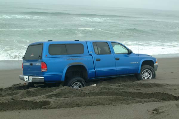 This weekend I am hiring a model to do several photoshoots and one that I had planned was going to take place on the far end of Centerville Beach where there is a bunch of huge pieces of driftwood. I came across this area while riding the ATV and thought it would be interesting for an early morning photoshoot. Since I need to transport the model, the make-up person, Lori, myself, and all my photogear, I figured I would drive down the beach, which is legal. I had seen similar trucks do it all the time, but I wanted to do a test before the real deal. As you can see the test failed. I ended up having to call around to find someone with a huge farm tractor to pull it out. As it turns out though the guy that ended up helping me was someone I had wanted to meet anyways, although under better circumstances. He’s a big time motocross rider and several people have mentioned his name to me as someone I should get to know. The price for towing my truck off the beach is to take him and his wife out to dinner at the Ivanhoe. Pretty good punishment for doing something stupid if you ask me. And further proof that Ferndale is a really great place to live! Needless to say, I am working on Plan B for the photoshoot.